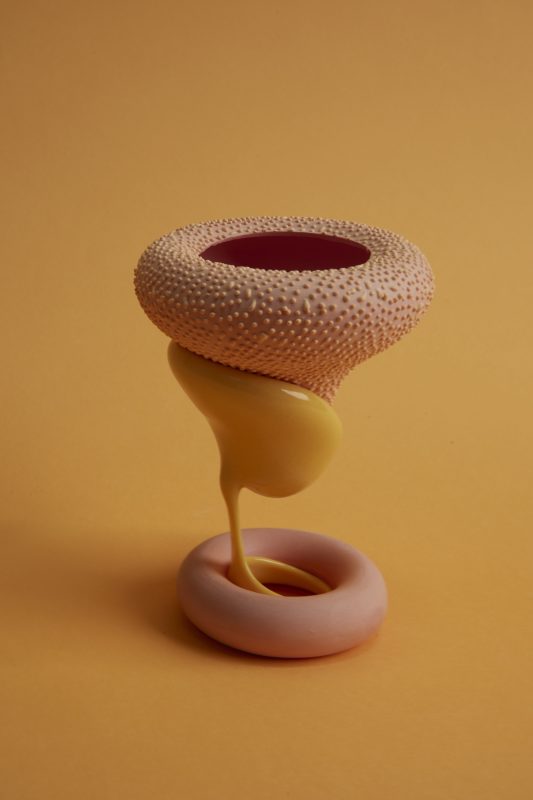 Through depicting a pearl necklace by representing its form out of a 2d sheet of pierced copper, Dettar’s work encapsulates the celebration of adornment that darts across the show. Throughout, hoop earrings appear dangling from pot handles in the work of Karine Hilaire, larger than life wooden bangles fit for a giant by Iseabal Hendry appear over at Craft Scotland, and Xanthe Somers punctures her vessels with body modifications in an all frills, no spills approach that refuses to take itself seriously, and differentiates from the linen-clad, pine wood aesthetic that has had middle-class culture in a chokehold for the last couple of years.