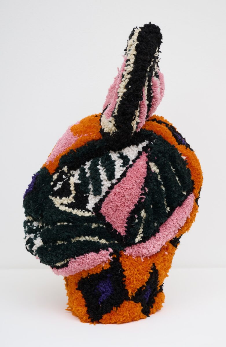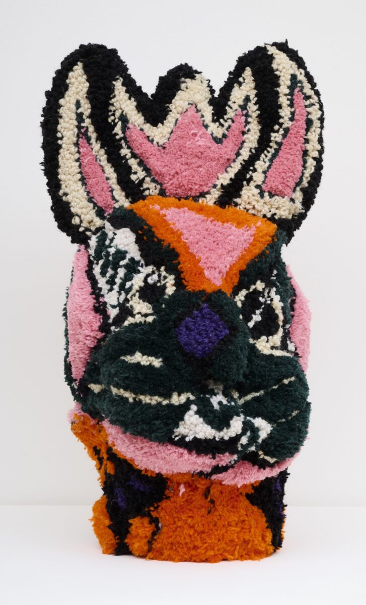 Perach’s sculptures thread the line between the beautiful and ornamental as well as the grotesque and eerie, challenging the boundaries between fine art and craft. Using tufting, a traditional and labor-intensive textile technique, the artist reimagines archetypes as hybrid forms that question prevailing cultural myths surrounding gender. Central to Perach’s practice is an exploration of the “monstrous” body—a concept that feminist theorist Donna Haraway uses to imagine new, counter-hegemonic forms of existence, adaptation and imagination in a fractured world. Thus, vilified female archetypes—such as witches and monsters, figures often marginalized for transgressing social norms—are frequently Perach’s protagonists, through whom she reflects on contemporary societal perceptions of femininity and otherness.