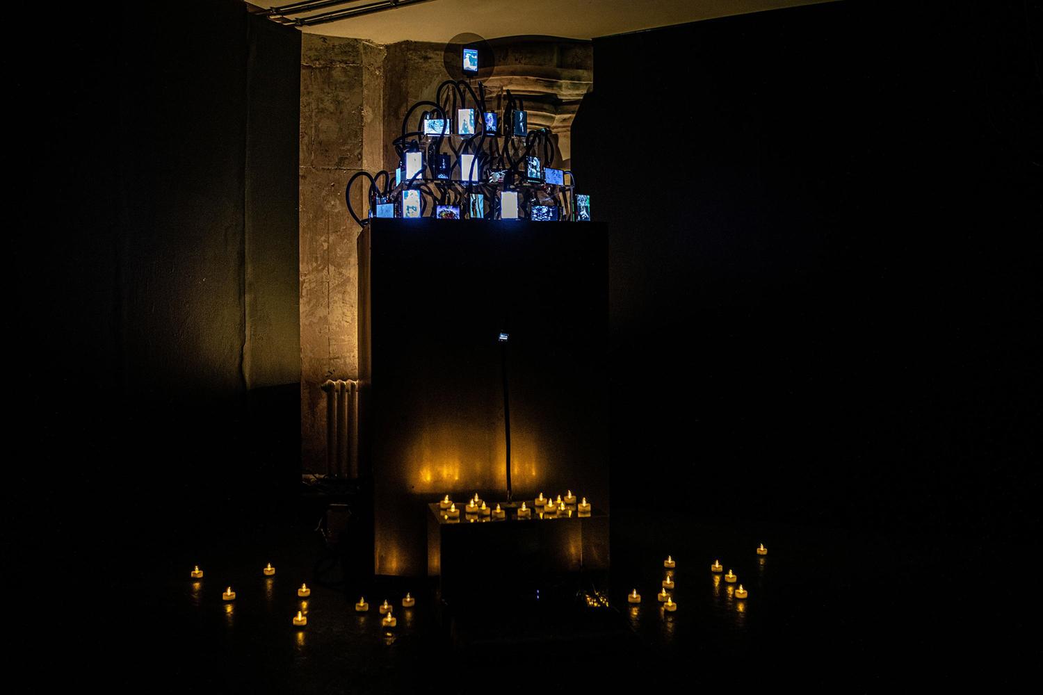 New Deity presents a liturgical interface, a mechanical altar peopled with generative saints and algorithmically composed blessings. Visitors must kneel and shine their torchlight upon the altar to receive a personalised invocation, a GPT-generated fragment that hovers between revelation and recursion. The deity here is not omniscient or transcendent, but a recombinant, polytheistic aggregate that continually renews itself.
