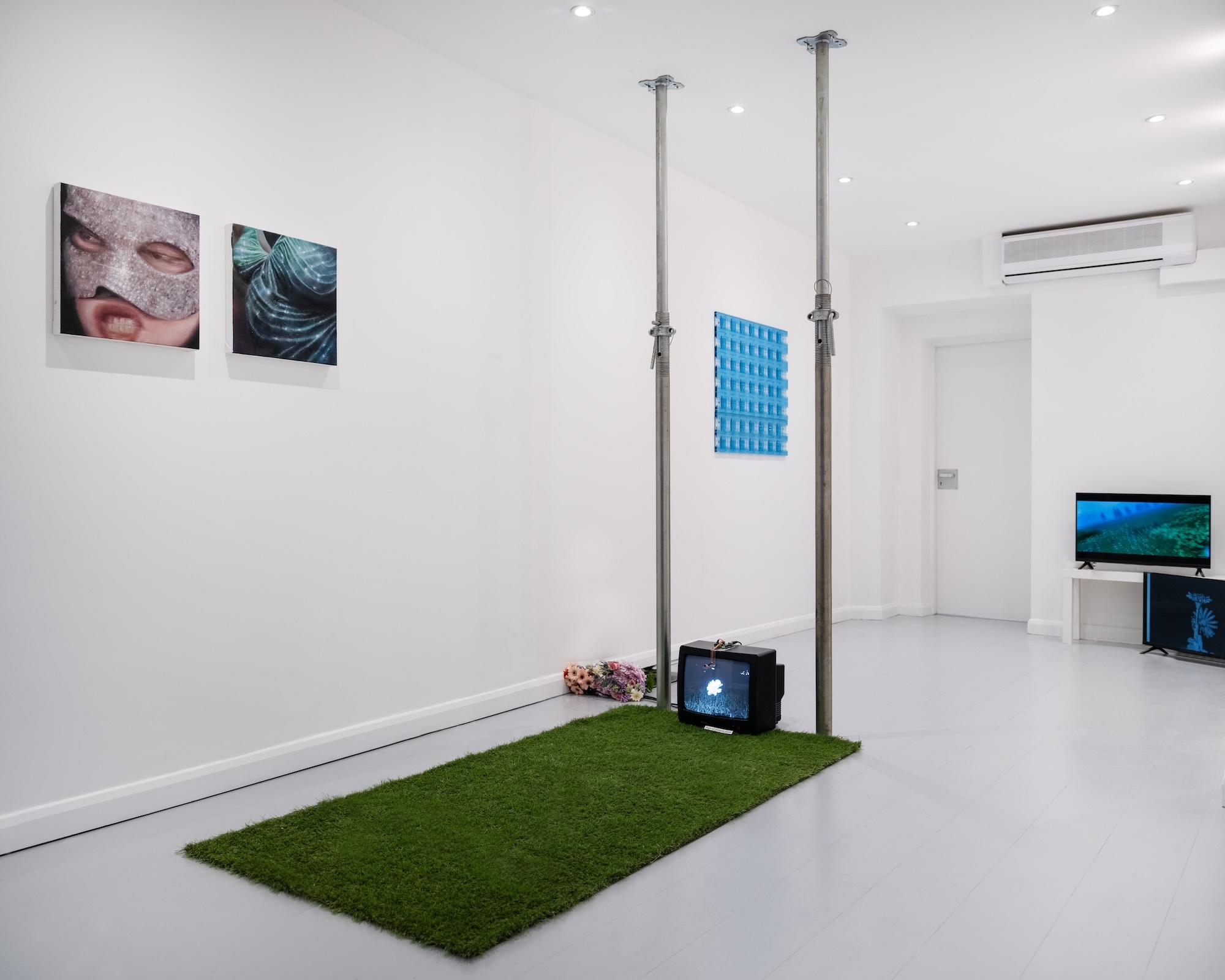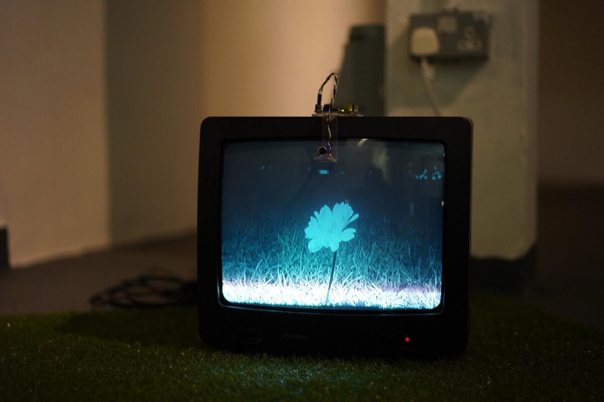 Flower belongs to a growing sequence of installations that imagine fragments of an imagined world. This work further articulates Bobby’s speculative cosmology by envisioning a technologised natural environment, where digital ecosystems have replaced organic presence. A CRT screen embedded in synthetic turf displays a blossoming virtual flower that responds to human breath. As the reclining viewer exhales, the bloom gently moves.