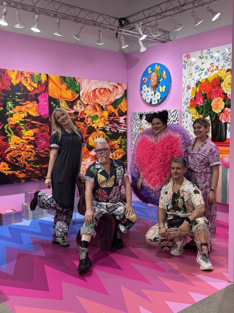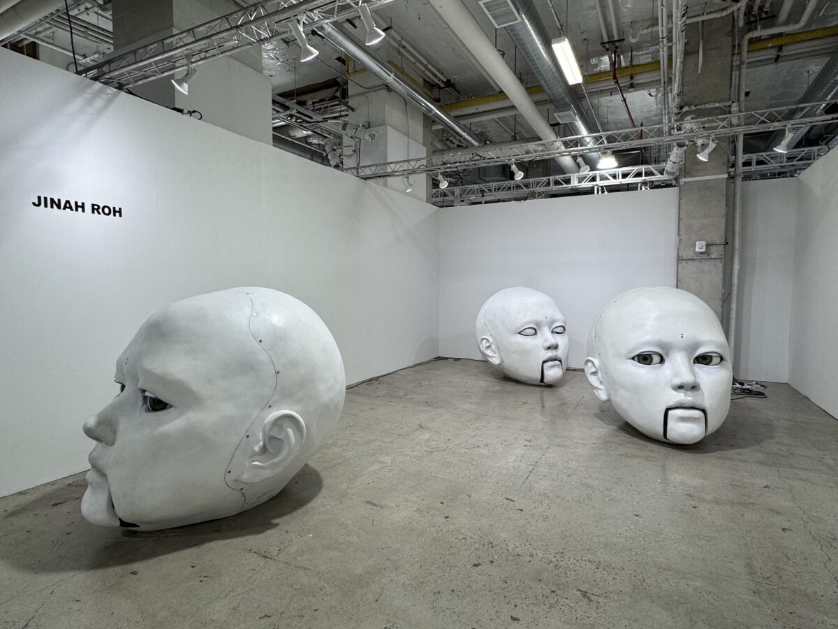 Indeed, the biggest and boldest booths ring this gathering space. New media sculptor Jinah Roh has installed four huge, functioning human heads. One had eyes that followed me as I pranced about. The works arrived by sea at 2pm that day, Ozaki said. I snuck a peek at their brains mid-install. Smaller than I thought. Nearby, enter the bright pink wonderland of Ashley Longshore, the self-professed “feminist Andy Warhol” who left her infamous New Orleans atelier for New York two years ago. Bouquets bloom in this other cult favorite creator’s maximalist acrylic paintings. Her glittery, wall-mounted letters deliver dirty jokes, and her sculptures bear famous faces. Elon Musk appears on a big Black card with neat lines of white powder atop it.