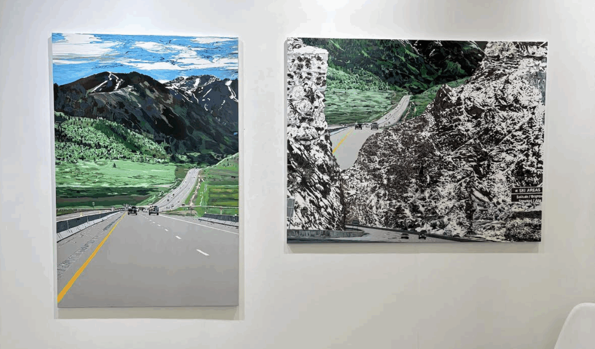 Section P also features an open call booth. Focus Art Fair’s curators chose four artists from hundreds of applicants. That corridor then opens back out on Section B’s conclusion—a ring of booths surrounding the lounge, where opera singer and pianist Alice Wang performed opening night, with violinist Stephanie Yoshida and cellist Allen Liang. Stage right, “extreme performance artist” Angela Nikolau debuts the starkly new body of work she’s teased to her 1 million IG followers since December. Do you think Nikolau caught “Welcome to the Rabbit Hole” last Fall?