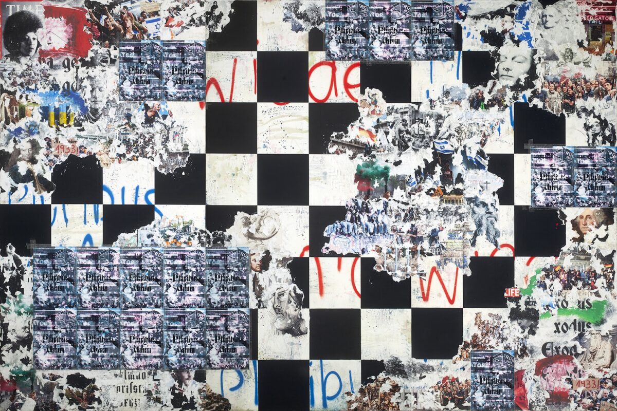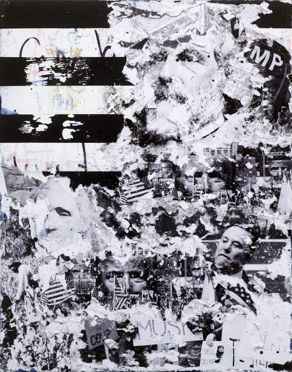 A key focus of Ellis’s work is the mechanics of political messaging. Throughout the exhibition, he draws on protest signs, propaganda, posters, and graffiti—layering and distressing them to create surfaces that appear weathered and torn, evoking city walls from across the globe. These overlaid textures reflect how public messages are constantly shaped, challenged, erased, and rewritten.