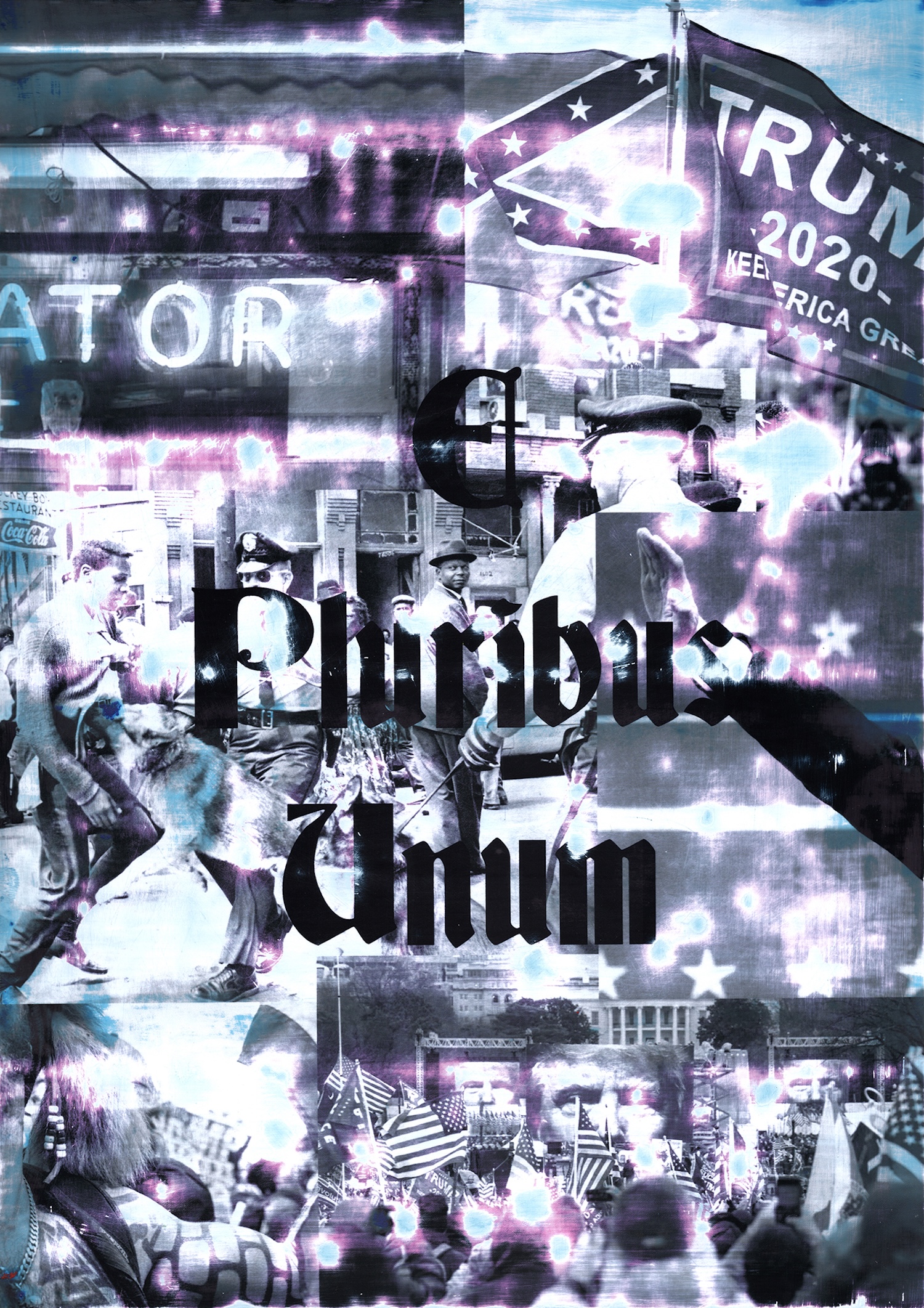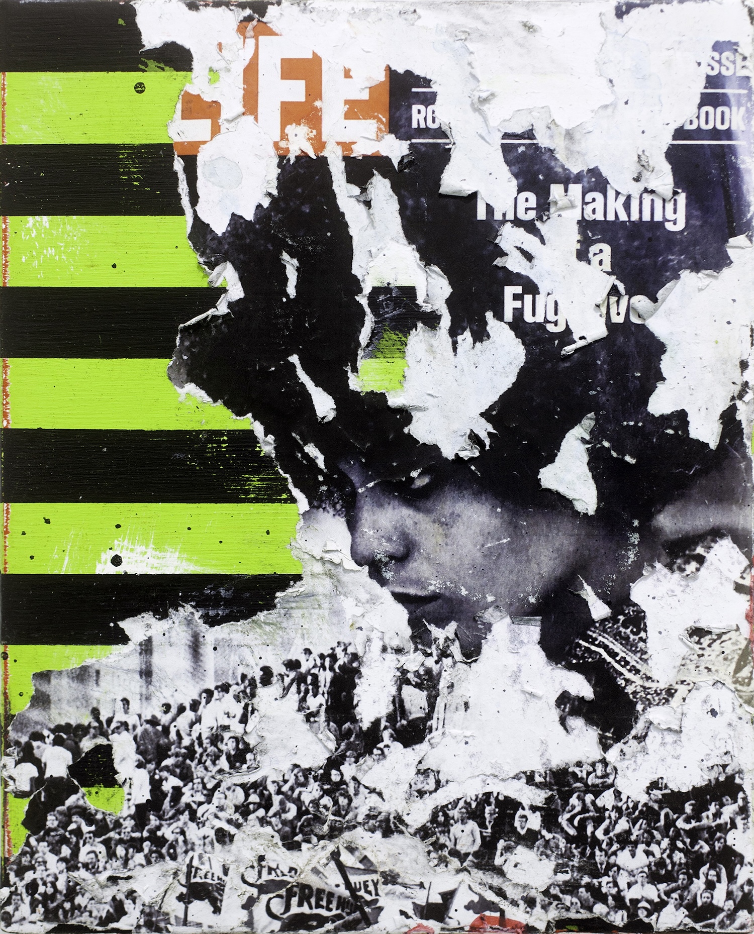 Using layered abstraction, collage, and text, Ellis creates complex works that reflect on revolutions, resistance, propaganda, and protest.