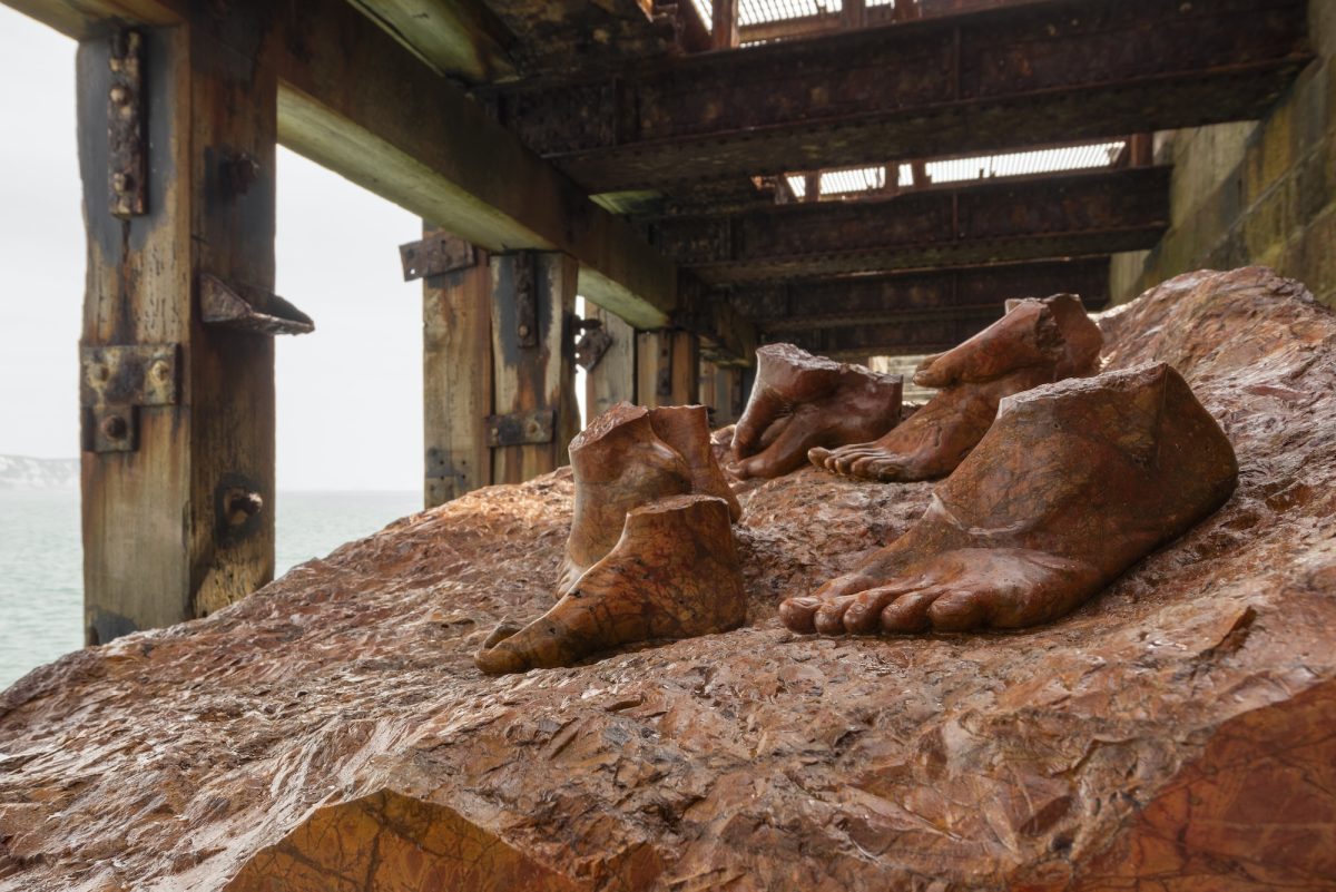 Dorothy Cross’ Red Erratic will be shown at the water’s edge, on a loading bay on Folkestone Harbour Arm. Erratic is a geological term used to describe a rock which has been moved by a glacier over time and deposited in a new landscape. In Dorothy Cross’ Red Erratic, human feet emerge from a 7-tonne block of ‘Damascus rose’ marble, perilously positioned one on top of each other as if to gain a foothold. Red Erratic speaks to the present-day realities of forced evacuation and migrations, as well as of a timeless deep connection to the earth, as if exposing fossilised human traces on the surface of a rock.