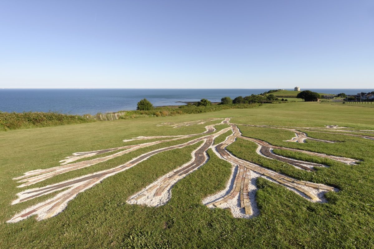 Jennifer Tee’s Oceans Trees of Life is a large-scale installation made of 5000 bricks on the East Cliff. Oceans Trees of Life takes inspiration from the early environmentalist Rachael Carson’s seminal book The Edge of the Sea which describes the unique conditions of life in the intertidal zone. Unfolding a seaweed form in the ground of East Cliff directly above Folkestone’s warren, the work is made from handmade bricks in colours that evoke the reds and greens of seaweed, as well the chalky cliffs nearby. The individual bricks are embossed with stamps of seaweed and life forms which inhabit the sea in the present day, as well as those preserved in fossil form.
