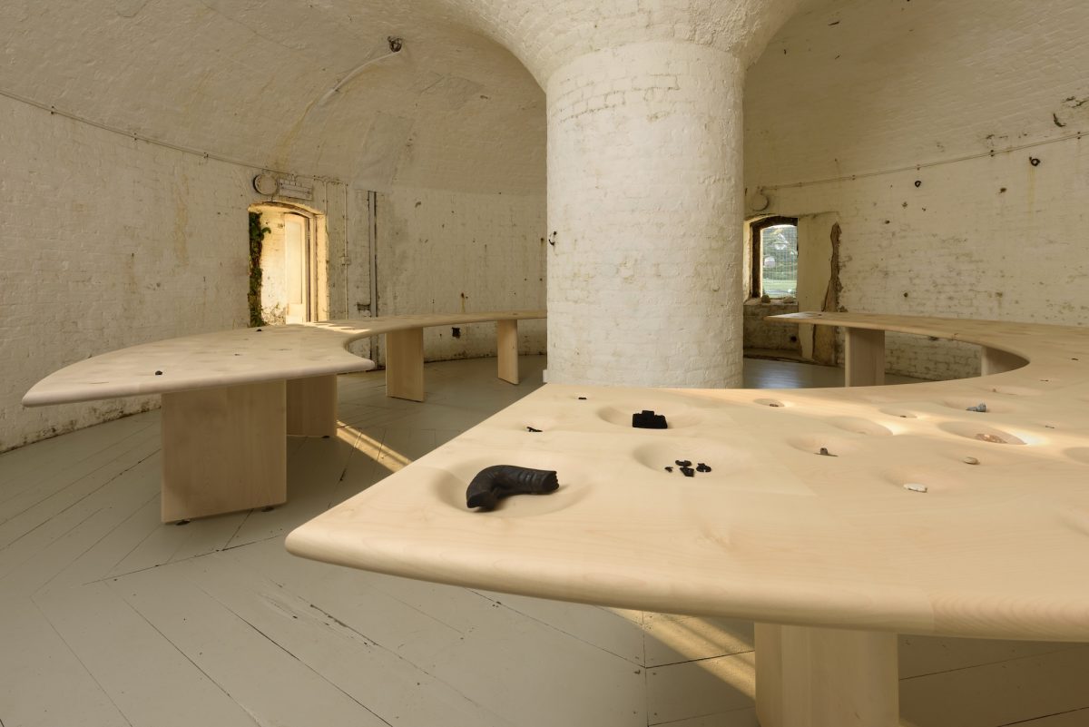 This year’s commissions will take over some of Folkestone’s most striking and unusual locations, including a church built for the fishing community, a former customs house, a Martello Tower, a lookout point across the Channel, and a disused railway bridge. From large-scale installations to immersive soundscapes, collaborations with local communities, through to computer simulations, designs for a new playground, amulet filled towers, a Ministry of Sewers and creatures appearing including a five metre long worm and three headed bird, artists will respond to the town’s geological, social and political history, to reflect on some of the most urgent issues of our time.