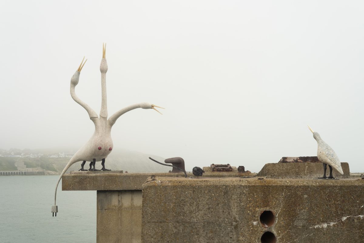 Laure Prouvost has made a new sculpture for the ‘dolphins’, the large concrete plinth-like structures created to support the ramped access to Folkestone’s roll-on roll-off ferries, now left rising from the sea. Visitors will see a striking hybrid bird with three elongated heads, each extending in a different direction. The body is crafted in terrazzo, a composite material made from fragments of stone, marble and earth-bound minerals, grounding the sculpture in the materiality of the land. Its surface speaks to geological time and human construction alike, while the beaks made in glass echo the ever-changing, translucent nature of water. The hybrid bird reaches out to its baby, stranded on the opposite plinth, mirroring a dialogue across the sea with two other monumental works by the artist, located on the Belgian and French coasts, in De Panne and Dunkirk.