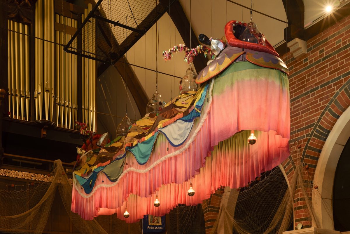 Rae-Yen Song has created a five metre long colourful beast, floating above us, with soft folds and many faces. It is shaped by stories from the past, and one day will come alive when worn by the artist’s family in a future performance. This creature mixes traditional Chinese dragon and lion dance costumes with sea creatures and worms. It floats as a shining shelter, an armour and a refuge. The work will be shown at St Peter’s Church, built in the nineteenth century by Folkestone’s fishing community, and home to the annual Blessing of the Fisheries.