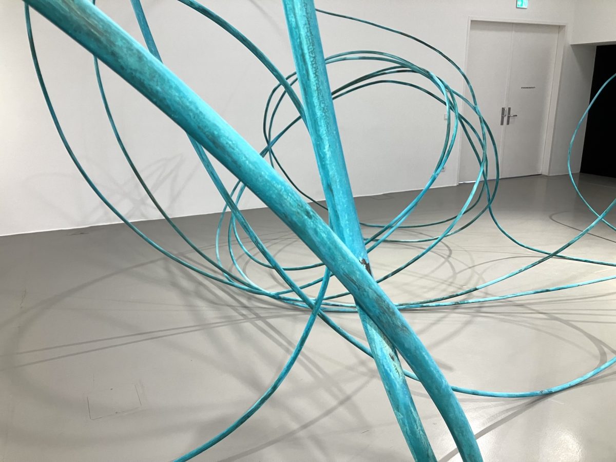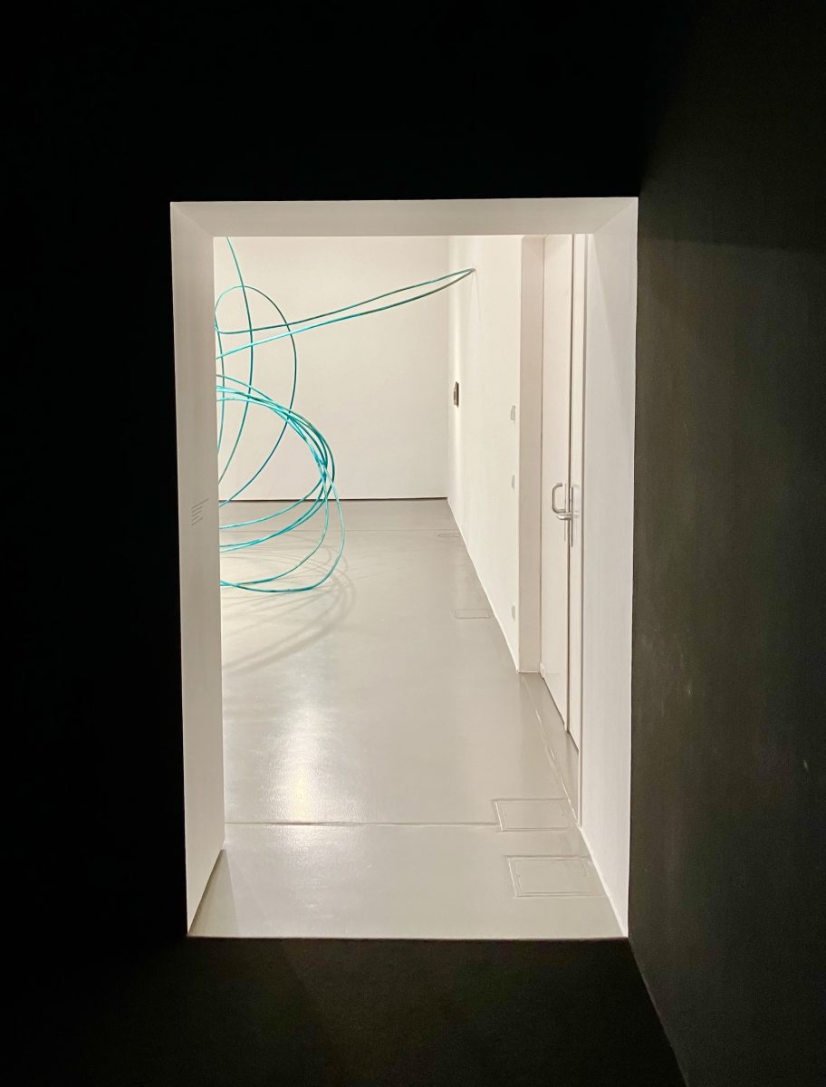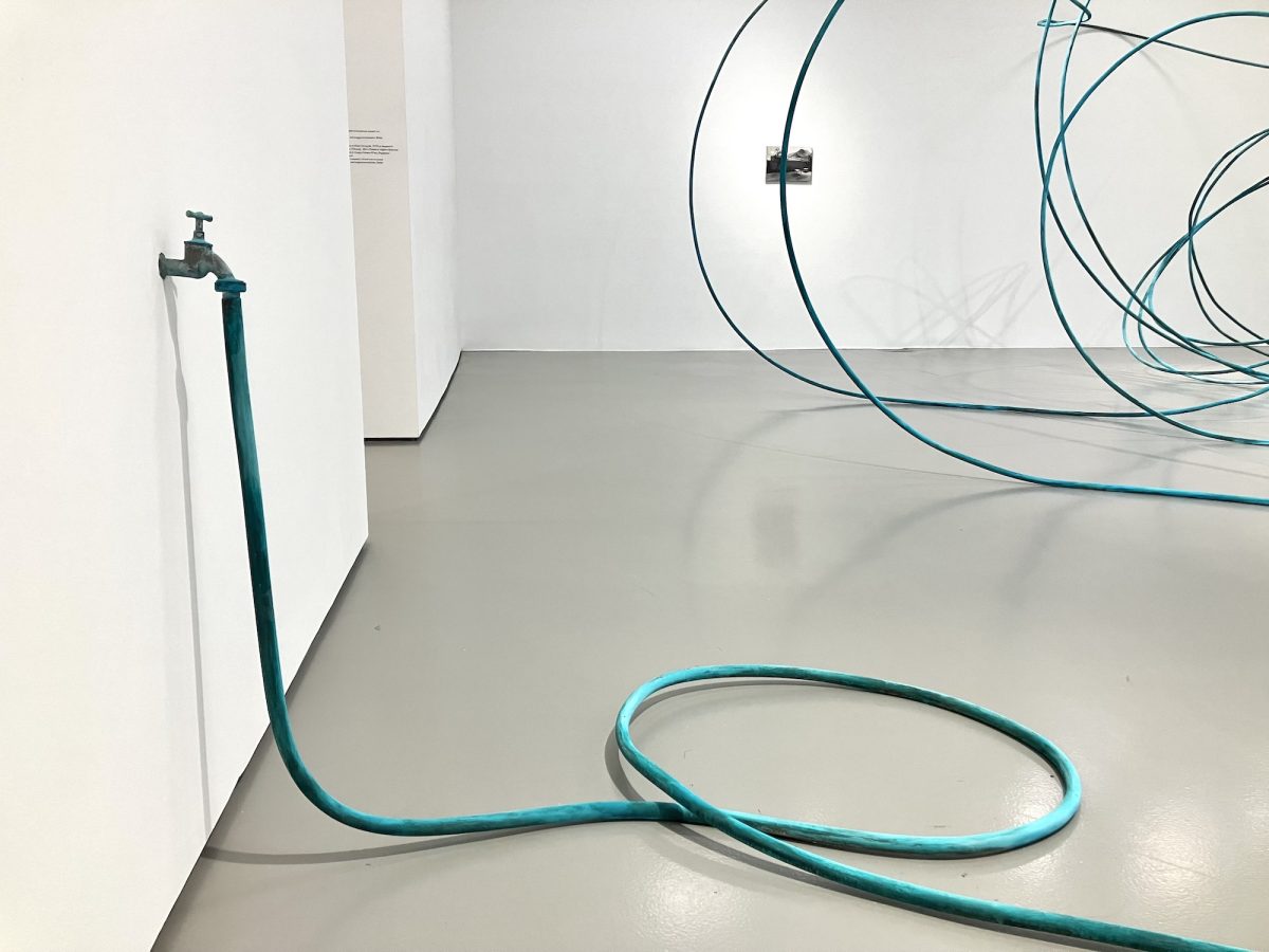 Xoco unfolds onto the undated sculpture Manifestazione tangibile di una fantasia mentale, introducing another key theme in Torres’ work: Alighiero Boetti. Crafted from patinated copper and formed into an endlessly coiled garden hose, the piece nods to the Italian artist, to whom Torres has dedicated a series of works. This impressive undulation recalls Boetti’s Autoritratto (Mi Fuma Il Cervello), a self-portrait in bronze in which the figure is holding a garden hose and spraying water over his head. Torres takes it one step further, giving the hose a life of its own: untamed, tangled, and almost frantic in its pursuit of inspiration, as if it has lost control in the search for meaning.