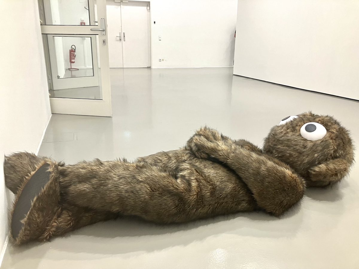 This is art for the patient, the curious, the conspiracy theorist within. And for the deeply bored. Which, to be clear, is not a criticism but possibly the point. After all, Xoco – Torres’ shaggy, cartoon-eyed creature who slouches, leans, and lies motionless throughout the show – seems to take boredom as a lifestyle choice, an existential coping mechanism, and a survival strategy. Throughout the run of the exhibition, the figure of Xoco, with his vacant Furbee-like gaze, appears in videos, performances, and in the [fur] flesh.