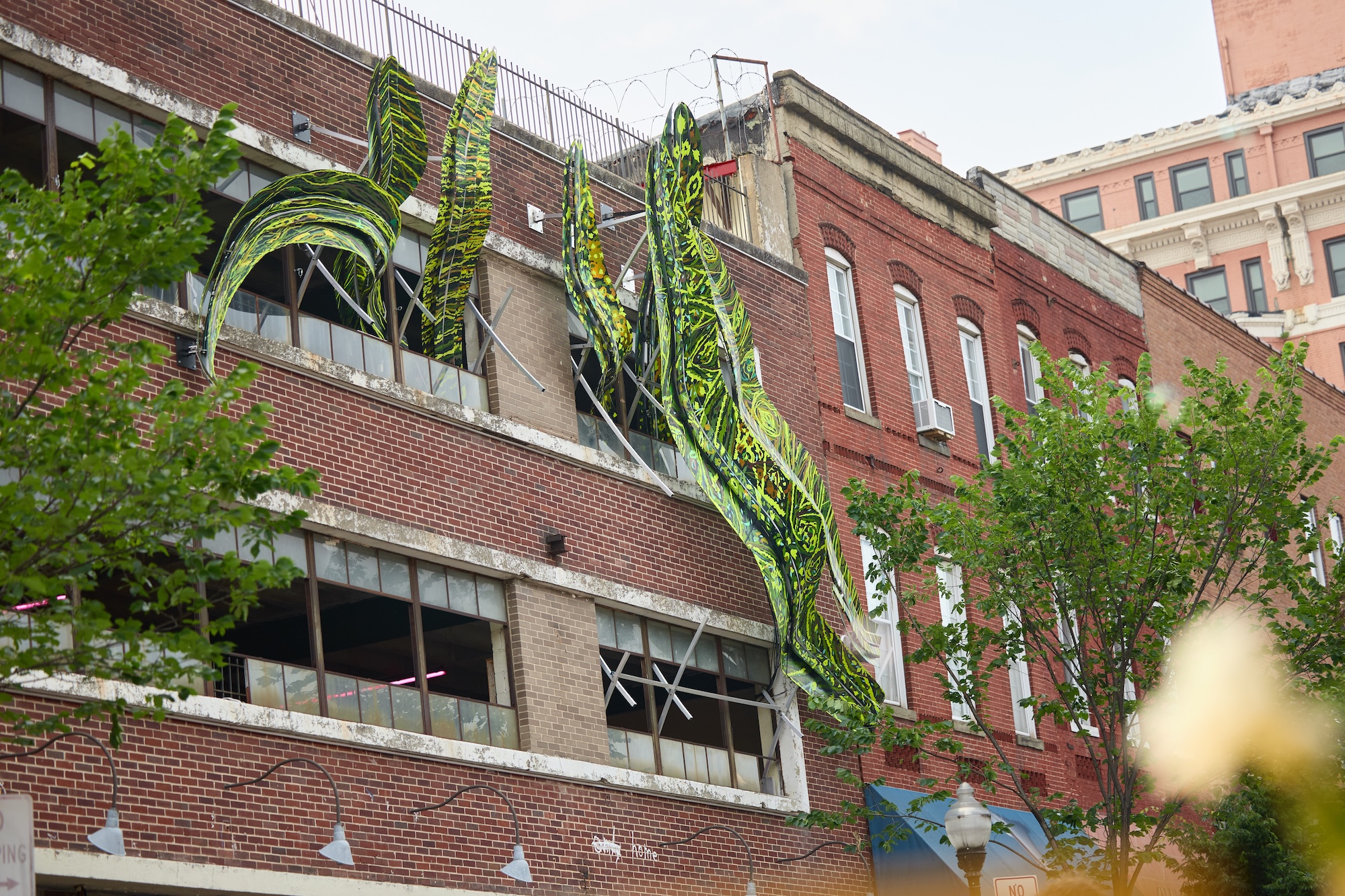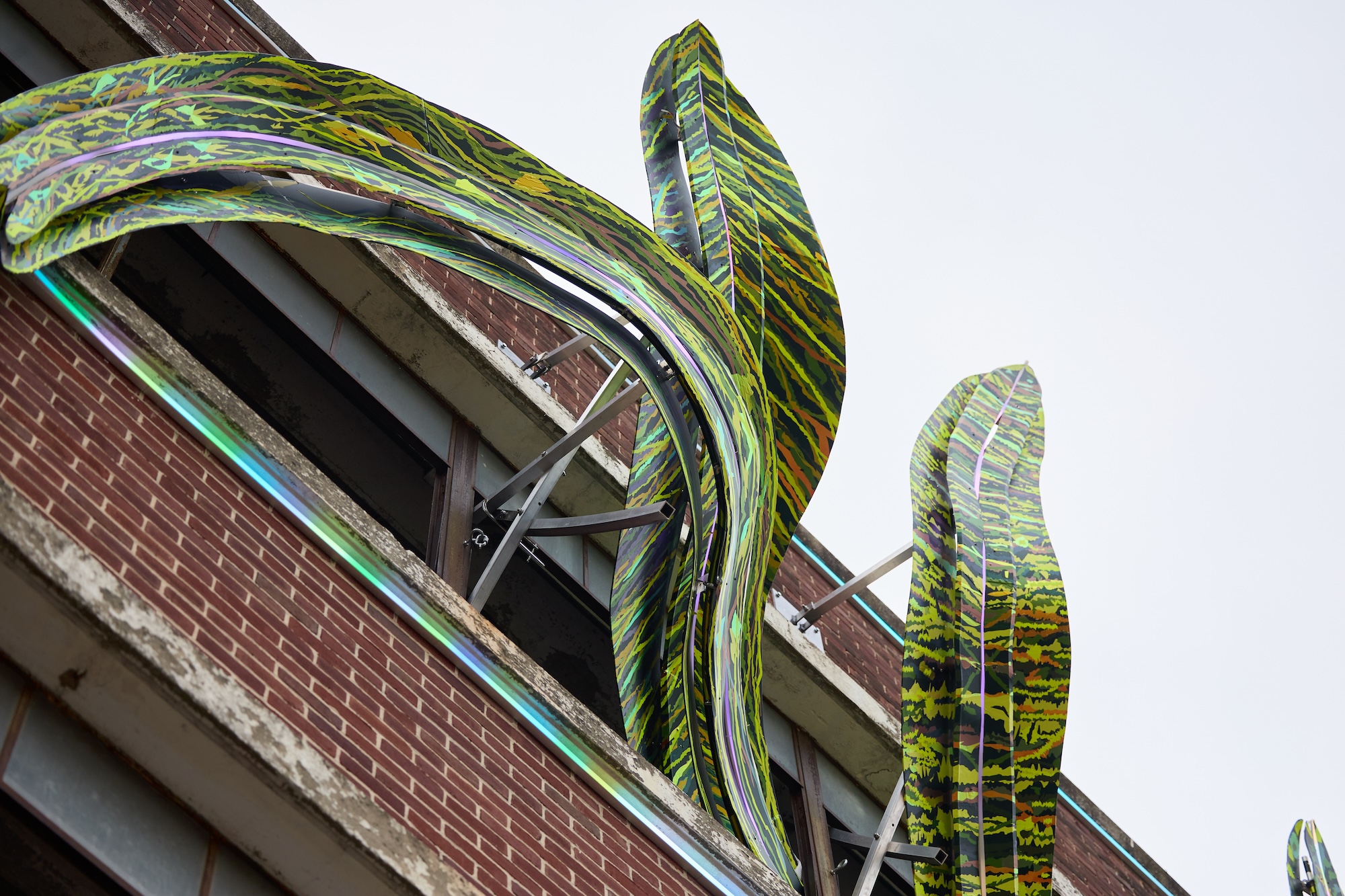 Big Ass Snake(Plant)s on a Plane transports the Charles Street Garage in Baltimore to a post-human world. Larger-than-life leaves with vivid colors and camouflage patterns are no longer passive objects of humans; they appear both aggressive and alien as they ‘grow’ out of the garage.