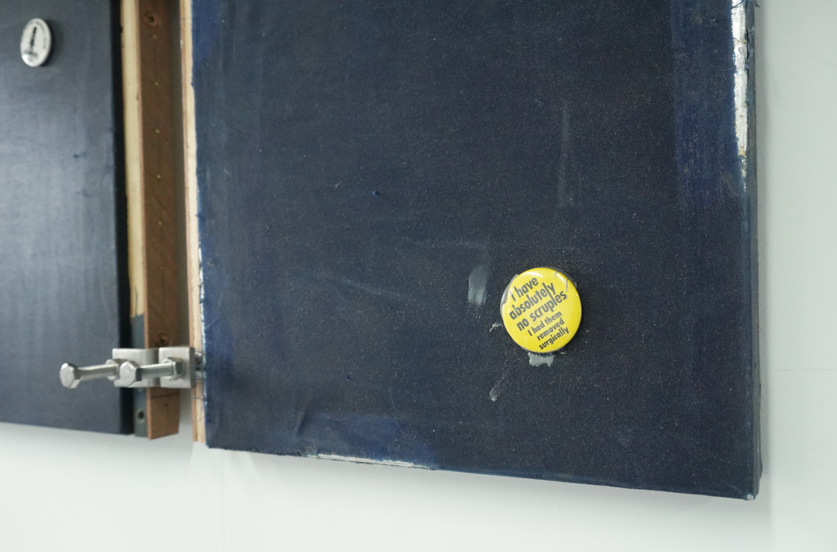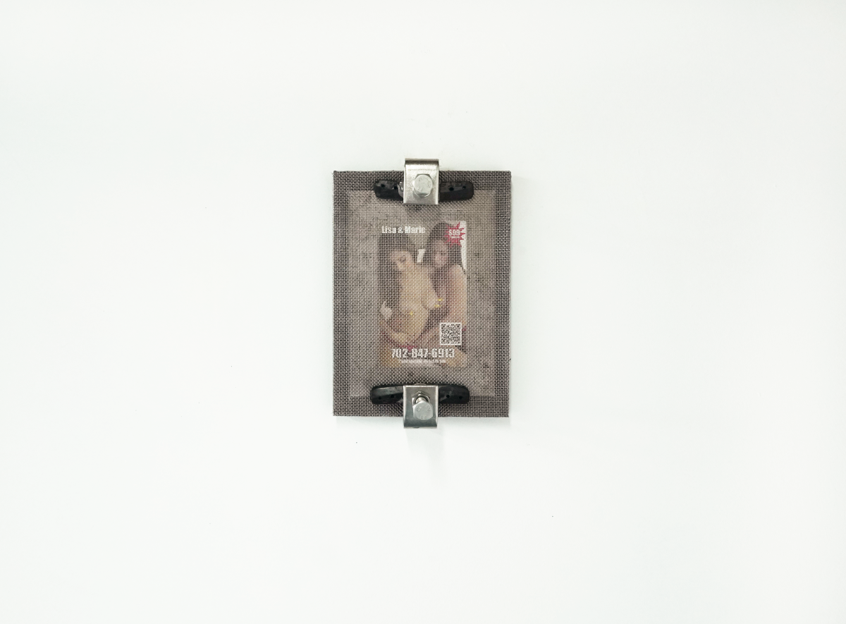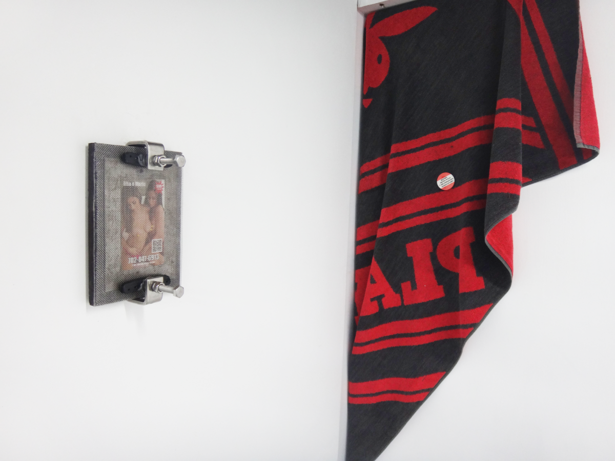 Dixon’s practice, like Rauschenberg, also escapes the confines of a two-dimensional picture plane, with works becoming a ‘receptor’. Drawing upon her family history in trade, her surfaces recall sites of manual labour, converging it with the visual languages of sex, gender and fan culture. Images or logos are applied with force; chained, clamped and penetrating the structure of each work. Dixon’s assemblages instil weight and dimension to the flat picture: she makes ‘things’ — picture or material — look corporeal. In Knock Out, the veins of plastic wrap enclose the flexed muscles of wrestlers. Stretched over, held taut and exposing their frames, Dixon’s works often materialise desire. Desire as a state of suspension. A subtle, unresolved tension of fabric that rivals the immediacy of the erotic image.