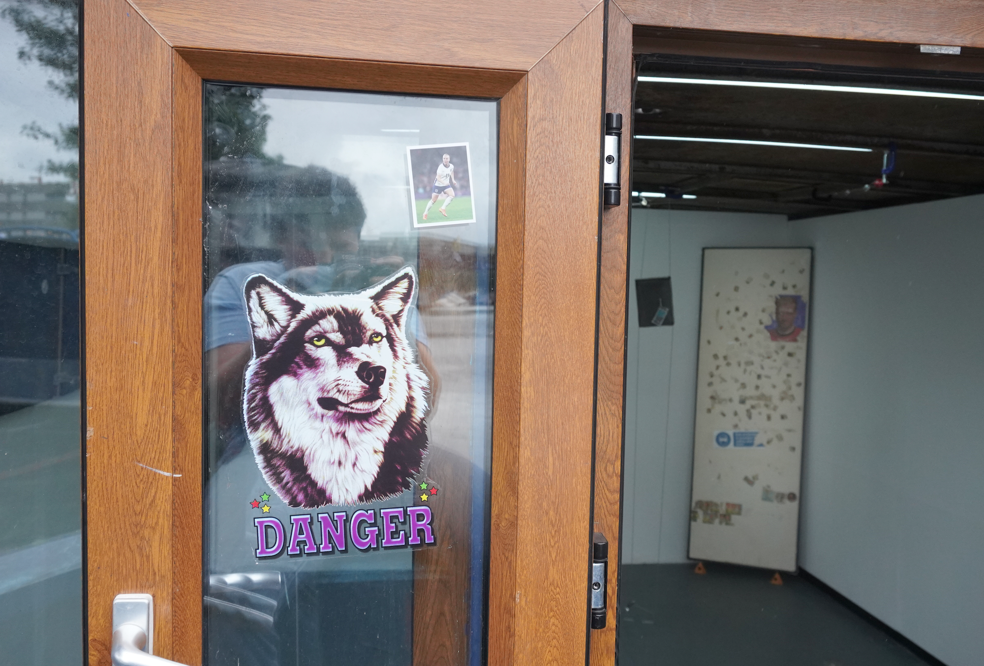 The exhibition features a dynamic cast. The Ipswich football team, WWF wrestlers, sex workers, a lone diver. Appearing on collectible cards sourced by the artist, these characters appear in control. Though the cards name real individuals, they often read as archetypal, exaggerated ideals of hyper masculinity or hyper femininity. Dixon has a deft way of framing paradoxes, literally and metaphorically. Always playful, she highlights that the more something epitomises heterosexuality, the more it becomes camp. Jock-themed porn, fetishwear and parties are examples of how gay culture appropriates sport. In the artist’s own football work, the Ipswich team recede and emerge from a surface of glitter-covered construction mesh. The treasured cards have been folded or clipped, sometimes rendering the men anonymous bodies: it’s material that’s Dixon’s star player.