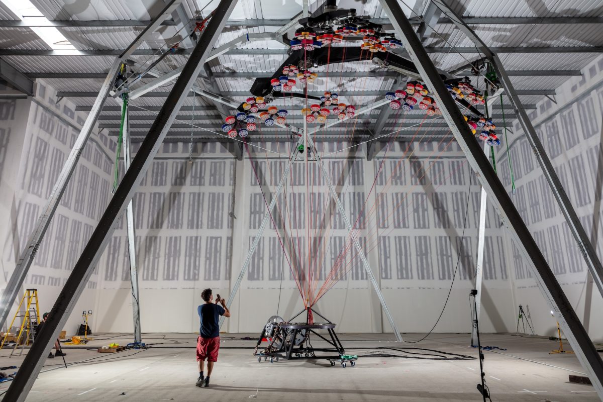 At 10m high, and spanning 12m in diameter the work is monumental in both its scale and complexity. Born of a late-night conversation over ten years ago with David Walsh, the visionary behind MONA (Museum of Old and New Art) in Tasmania, the machine’s 40 interlocking arms will incrementally weave a rope in a sequence of orbits that will never repeat.