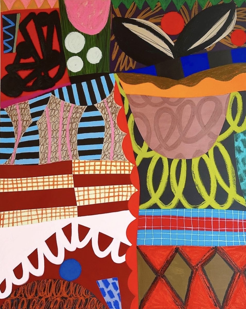 Colour is also central in Studio Wolffia’s work. Her palette is fearless yet balanced. A bold fusion of the full pop spectrum, from acid pinks to rich royal blues, matte peaches to textured mustards. There is an ease of approach here, echoed in how the images are made – in fast layers. This is work about play and immediacy rather than over analysis. We are presented with a sense of visual instinct.
