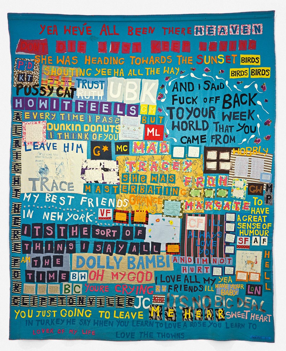 Emin frequently confronts personal trauma and pain, dispelling the stigma surrounding issues that are often left undiscussed. The exhibition addresses the artist’s experience of sexual assault, including the neon I could have Loved my Innocence 2007 and the embroidered calico Is This a Joke 2009. In one of her most personal video works, How It Feels 1996, Emin gives a challenging yet empowering account of an abortion that went wrong, describing institutional neglect, the physical and psychological implications of refusing motherhood, and the misogyny associated with it. Shown publicly for the first time, the quilt The Last of the Gold 2002 is emblazoned with an ‘A to Z of abortion’, providing advice for women facing a similar situation.