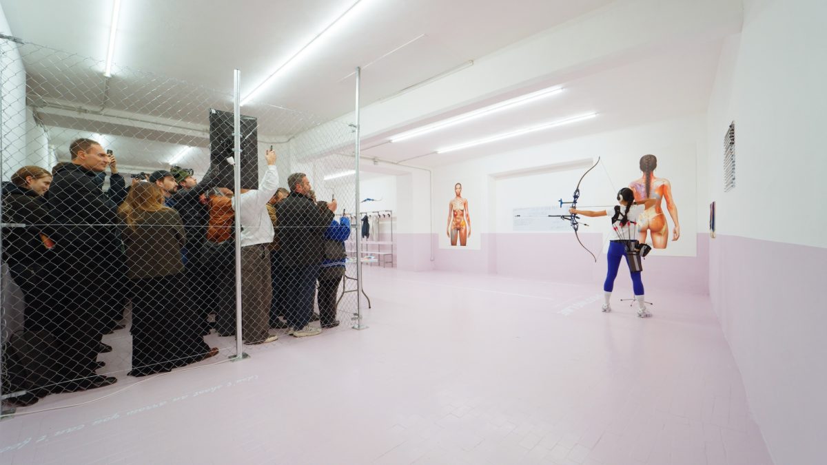 Since 2020, SAGG has also been active as a competitive archer. Her physical training and mental discipline have become core elements in recent installations and performances, where the act of aiming physically, emotionally, and politically becomes a central metaphor. Her 2024 solo exhibition Sempre Contratta at Basement Roma exemplified this synthesis, staging the artist’s body and sport tools as sculptural forms and healing devices.