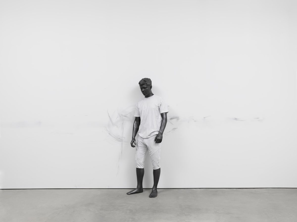 Elsewhere, the perception of time and value falters and fragments. In the courtyard, a monumental black sphere asks Why am I so distracted? (2025), perhaps invisible to passersby scrolling on their phones. In Everything is Titled, a mosquito twitches endlessly on a cake stand, suspended in the moment between life and death. Questions of value and exchange are addressed in Equivalent Economies and Equivalent Means (2018), a vending machine that once dispensed either a bundle of €100 notes totalling €10,000 or rounded stones collected by Gander and his children from a beach near their home. Presented with equal price tags until anti-money-laundering laws intervened, the work undermines systems of measurement and worth, asking how time, value, and memory become entangled. The Graphite-cast Bit Part Player (Balthazar, Merchant of Venice; Act 3, Scene 4) (2020) leans against the gallery walls, recalling the building’s former life as a drama school, where young actors waited endlessly in the wings for their fleeting lines.