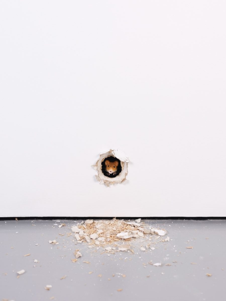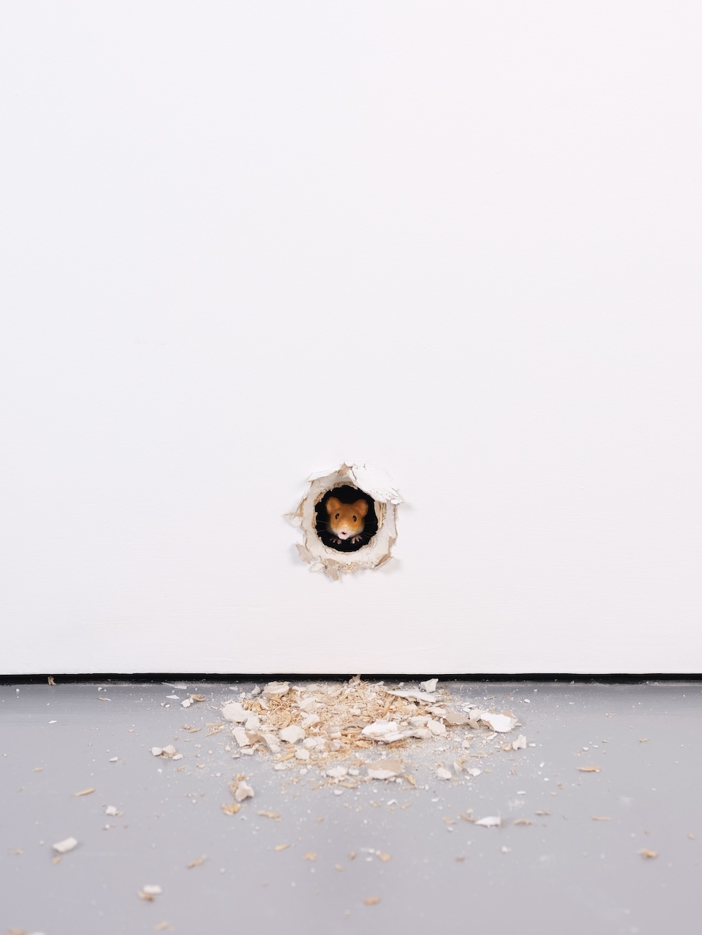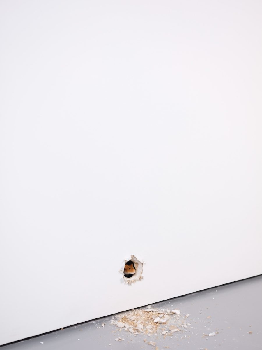 At the centre of the exhibition is The Storyteller: The sense that you are a part of a flow of a thing (2025), in which an animatronic harvest mouse emerges from a hole in the wall to deliver a philosophical monologue in the voice of the artist’s daughter. Reflecting on identity, commodification, and possibility, the mouse becomes the conscience of the exhibition, whispering to visitors about uncertainty and that imagination needs to be seen as an essential resource.