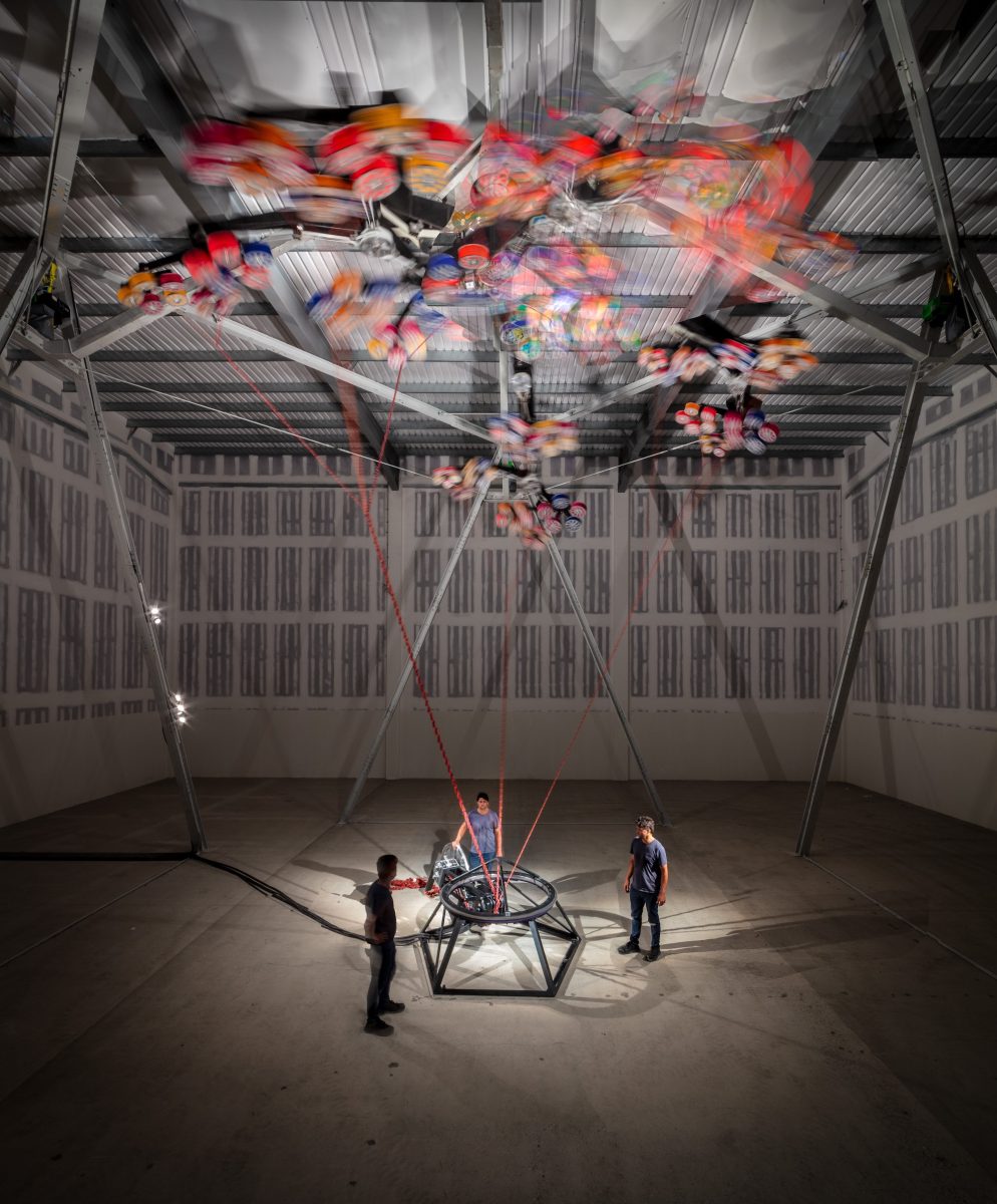 At 10 metres high and 12 across, it’s a vast mechanism of 40 interlocking arms that weave an endless rope in orbits that never repeat. Engineered in his Hackney studio, the work fuses art and mechanics with cosmic analogy: the rope drawn through its centre echoes the sun’s path across the galaxy, trailed by planets and their spiralling moons.
