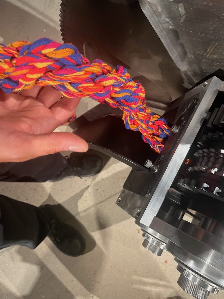 All of the previous rope machines have repetitive motions. This machine whilst weaving a rope, will never repeat. The 135 spools will never come back to the same rotation – one primary, three secondary arms, nine tertiary arms, 27 quaternary arms and 135 spools all driven by one motor.