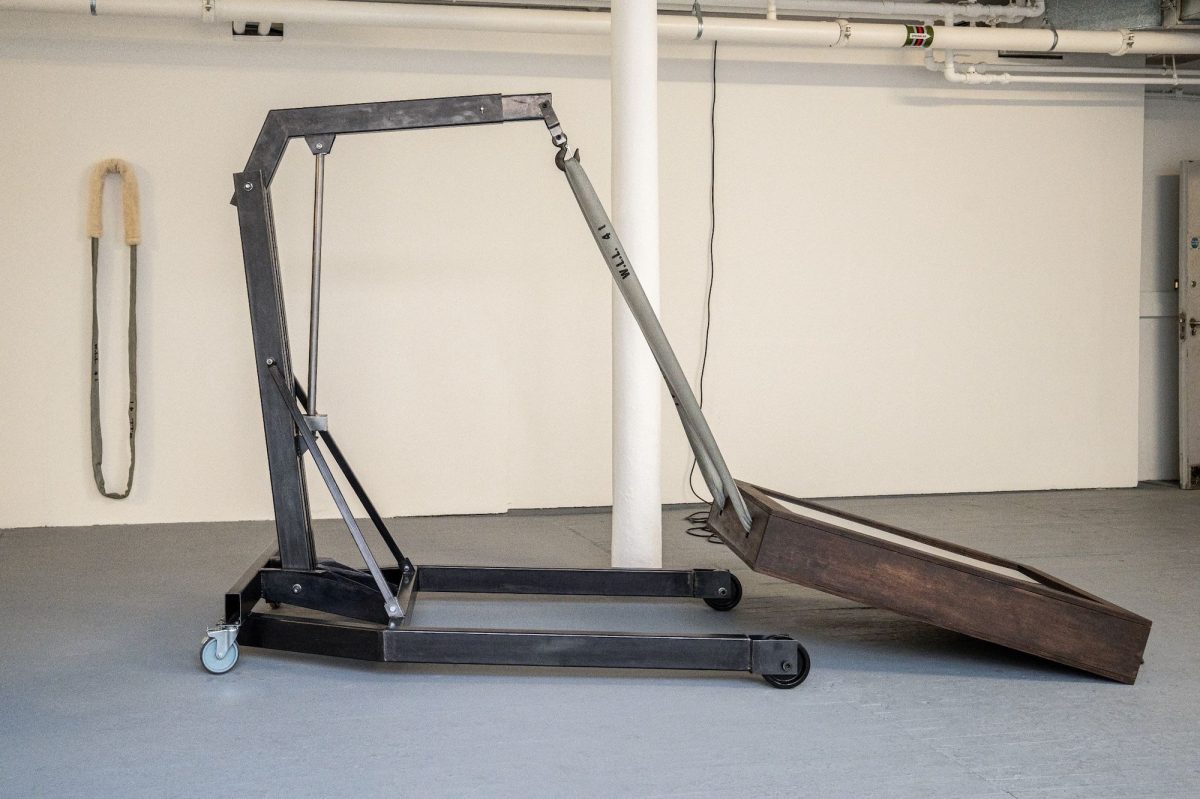 In the horse trailer, we encounter a sculpture reminiscent of an engine hoist crane – a machine more commonly found in a garage or workshop. Homann’s digitally preserved horse is suspended, slightly lifted yet restrained within a meticulously constructed wooden box. The crane’s sculptural form itself echoes the memory of a creature burdened by effort, its frame bent under an unseen weight, recalling the endurance of working horses. This duality of labour – caring for these animals, while also putting