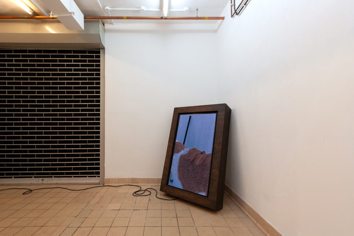 Back at the gallery, we find it’s companion – another monitor quietly nestled in the corner of the room like a sleeping animal. The footprint of the room hints at the idea of a stable, echoing the ethos of the nomadic element of the presentation. Alongside it rests a wooden form that recalls the structure of a yoke – a crosspiece traditionally fastened over the necks of two animals and attached to the plough or cart they are made to pull. Unlike its historic models, it’s been made to fit two animals of differing sizes, directly referencing the proportions of the two horses in Homann’s work. Were it ever put to use, the weight would be spread unevenly across their backs, one animal forced to bear more than the other. In doing so, this yoke becomes a symbol of imbalance and endurance, revealing the quiet inequities embedded within acts of shared labour.