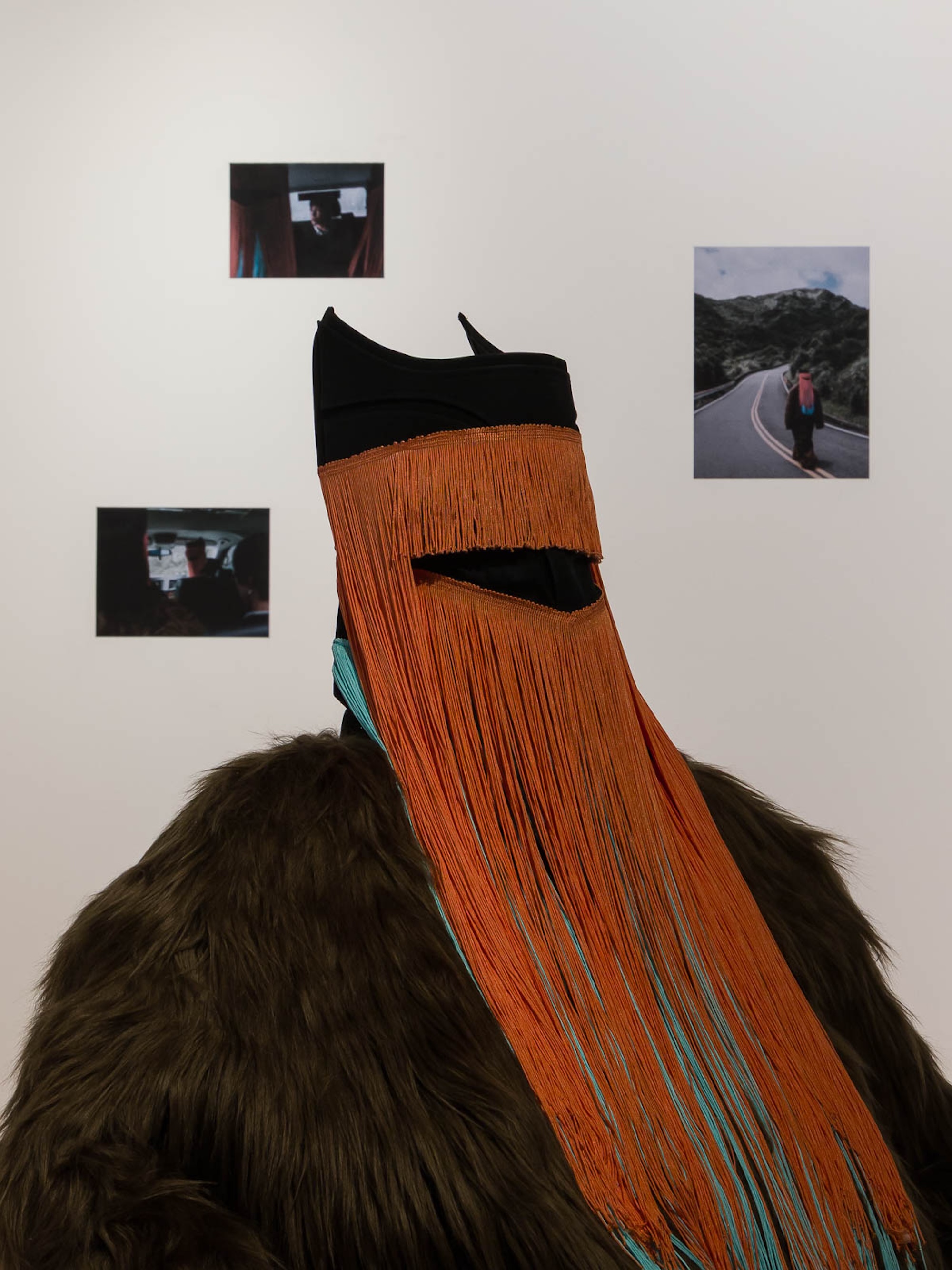 The exhibition features new iterations of two existing works: Valley in the Minibus (2024) and The Sorrowful Football Team (2025). Valley in the Minibus explores the concept of ‘non-places’, defined by French anthropologist Marc Augé as transitory spaces that people pass through (such as airports, motorways, shopping centres) and become anonymous. Building on the original work and live event that took place over several weekends, a group of strangers travel through a winding landscape in a van with a creature-like masked and costumed figure. A new video commission will introduce the same masked figure DJing completely alone in an anonymous space. Three full body, long haired costumes and veiled masks used in the work are on display as part of the installation. Present but disconnected from the audience, the presentation highlights the artist’s interest in creating connections and intimacies through isolated experiences.