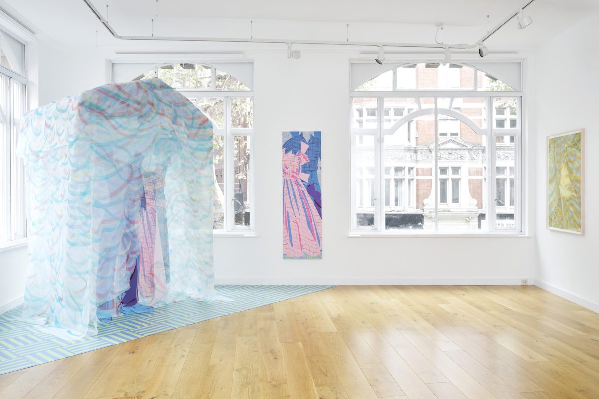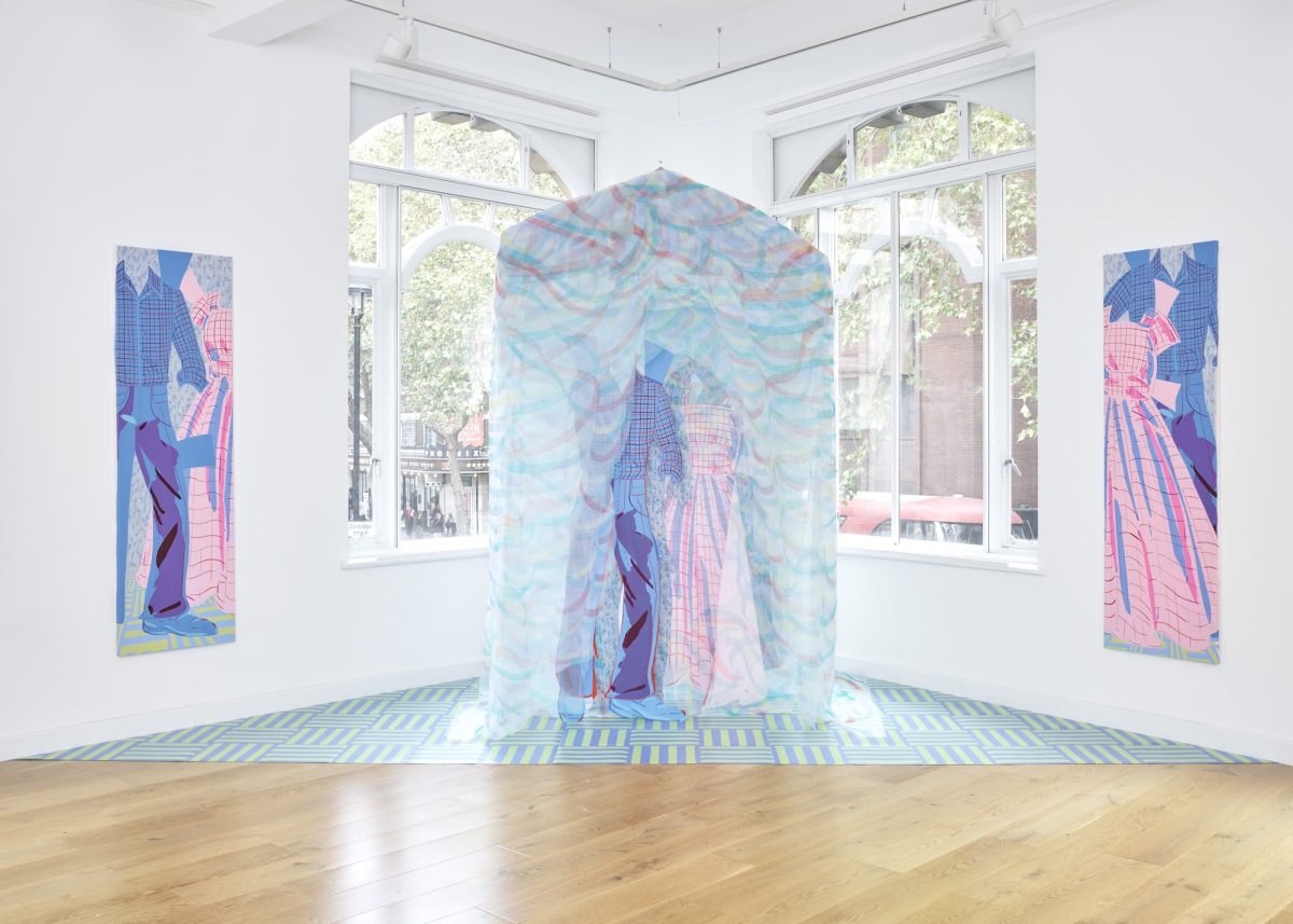 Life-sized figures referencing vintage cutout doll toys perform on a patterned stage, animating the onlooking paintings and works on paper. The installation becomes a portal into these paintings, its veil-like fabrics referencing the layered worlds of her pattern-clad canvases. Here we are invited into Tilson’s dreamlike world, one where the reflections of mirrored city skyscrapers become kaleidoscopic tartan fabrics, and accents of clashing colour pop and dance across a kinetic landscape of forms to create an electric all-consuming hum.