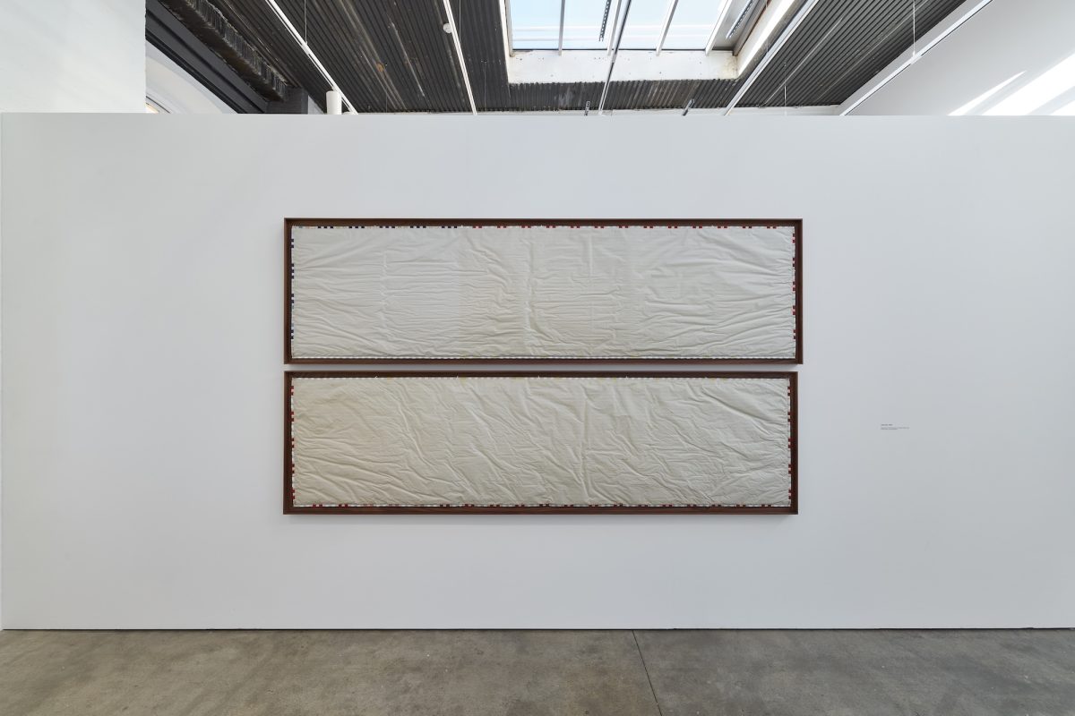 The largest of these works at three metres wide, Allomother, will address the American flag, which Sasraku approaches from the perspective of a British artist raised on American pop culture, and for whom the flag once embodied fantasy and aspiration. In Allomother, the iconic stripes of the flag have been burned into the paper using UV light, creating an image that emerges from the natural tone of the newsprint itself. The image, like the material used to make it, is unstable and will fade over the course of the exhibition, contradicting the American flag as a symbol that has seemingly indefatigable potency, and acknowledging its shifting meanings as American national identity evolves amid an unsettled geopolitical landscape.