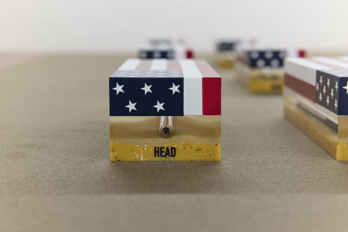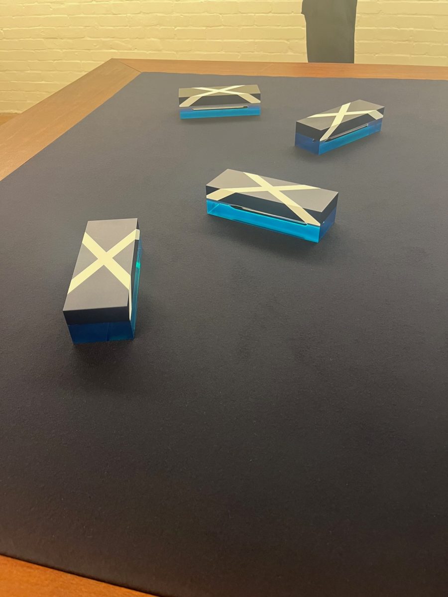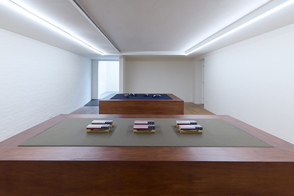 In the rear gallery, another series of paperweights continue Sasraku’s enquiry into the intersection of oil and nationalism. Two sets of newly fabricated acrylic sculptures, approximately the size of an Action Man box, resemble miniature military coffins. Each set references a site of war and/or oil extraction: one topped with a screen-printed Scottish flag placed over a North Sea landscape; another draped with an American flag laid across a desert terrain.