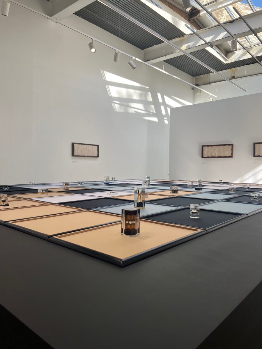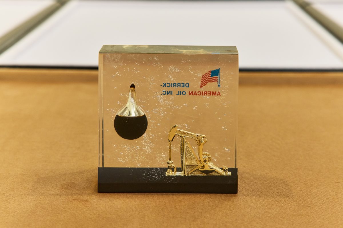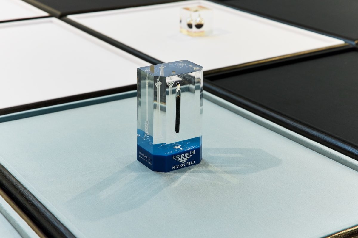 For this new commission, Sasraku collected a series of acrylic paperweights produced by oil companies, each encasing a small amount of crude oil sourced from extraction sites around the globe. In the exhibition, these corporate souvenirs will be repurposed into a monumental new installation staged on a giant tiled display in the ICA’s lower gallery. The strange and highly designed objects boast slogans of success and depict their origin landscapes, from the snowy oil fields of Siberia and Alaska to the deserts of Texas and Saudi Arabia and the waters of the Scottish North Sea. Taken from the executive desks and domestic mantels for which they were intended, Sasraku reconfigured them within a conceptual chess game offering a meditation on extraction, pride, and empire.