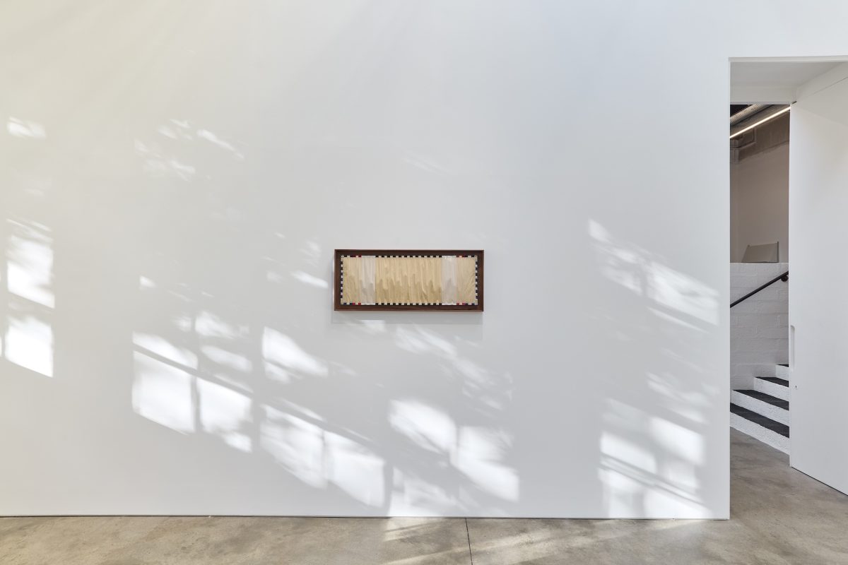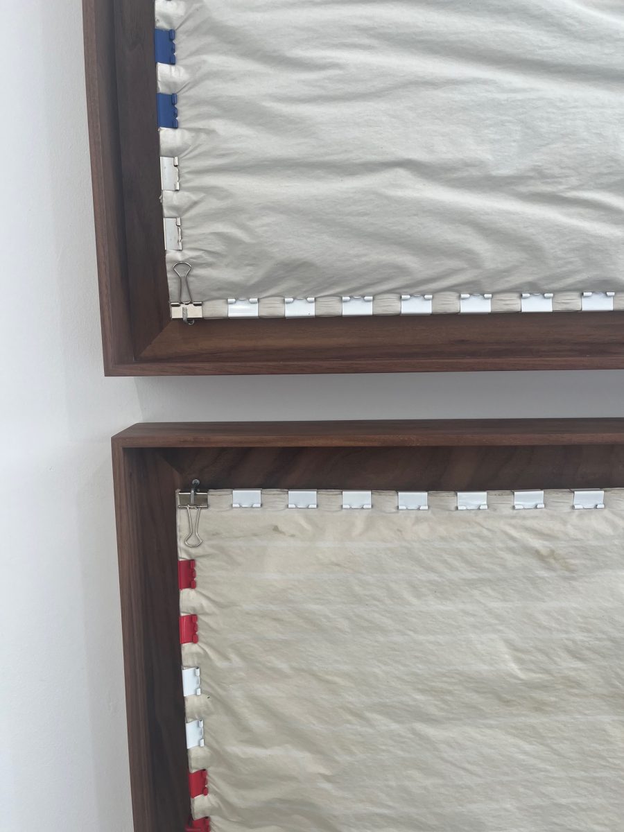 The exhibition also includes a new series of works on paper, examining military and national emblems, symbols which distil complex and often devastating histories into designs that can be worn and celebrated as individual achievement. Service ribbons such as the Kuwait Liberation Medal, the Global War on Terrorism Expeditionary Medal, and the Prisoner of War Medal, among others, are rendered in muted, UV-printed patterns on thick stacks of newsprint which warp and ripple like fabric from the artist’s experimental printing process. Sasraku relegates the bold colours represented in these ribbons to the outer edges of the paper, using brightly coloured binder clips to mark their symbolic hues. The centre of the page is left pale, drained. These materials of newsprint, binder clips and paperweights, evocative of administrative bureaucracy, speak to the faded ideals and the aesthetics of power.