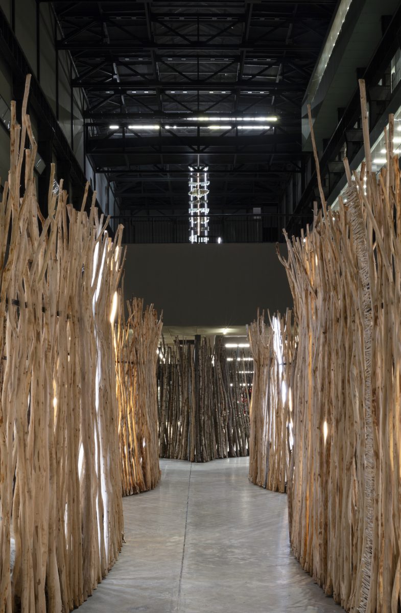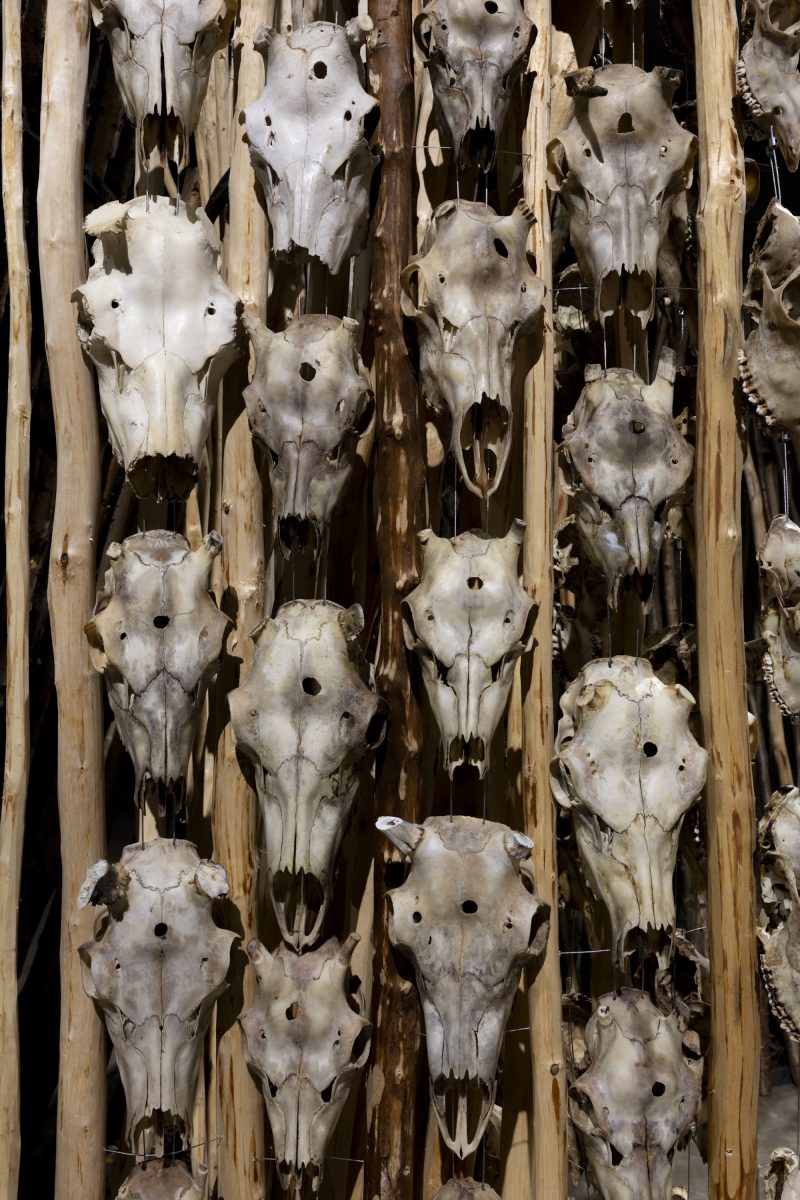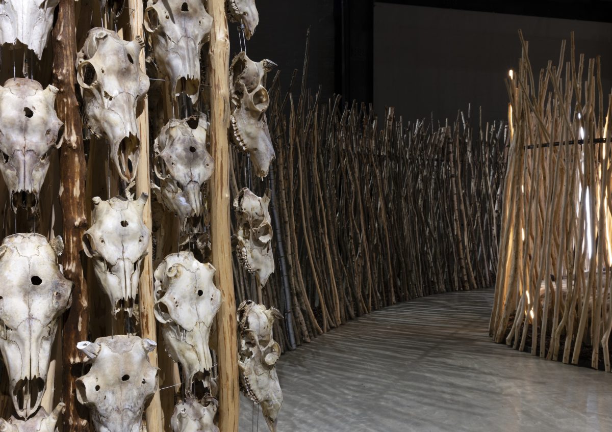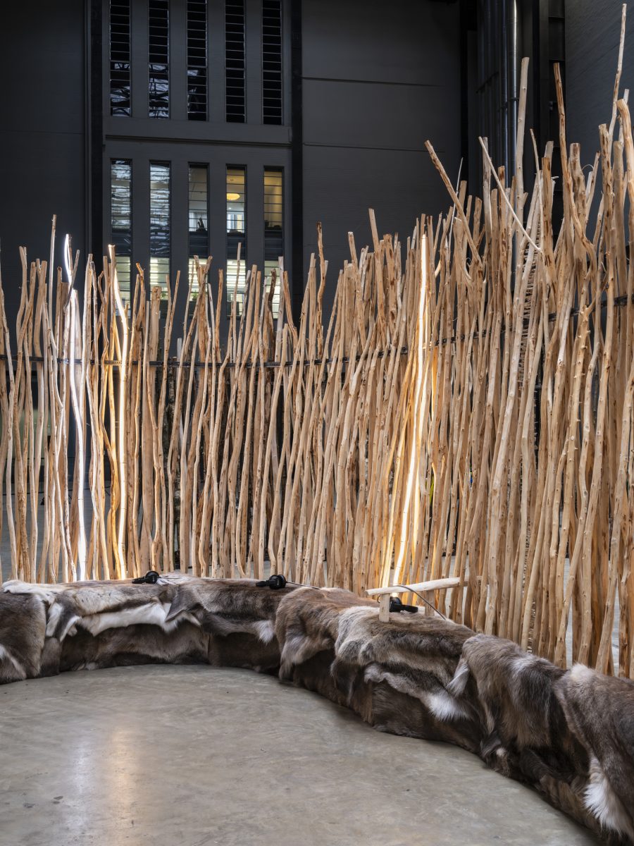 At the east end of the Turbine Hall, you can move through a maze-like structure based on the anatomy of the reindeer nose, an organ which can heat air by 80°C in under a second. Titled -Geabbil, visitors are invited to attune themselves to the energy and ancestral knowledge that courses through the winding passages. The walls of the installation are constructed from wooden poles carved with reindeer earmarks, distinct patterns that are passed down by generations of Sámi people to distinguish their herds and indicate their lifelong commitment to safeguarding the animals and their environment. As part of the traditional Sámi practice of duodji, hides and bones are integrated into the walls, giving new life to parts of the reindeer not used for food or clothing. This ensures that nothing is wasted, serving as a gesture of gratitude and respect to the reindeer.