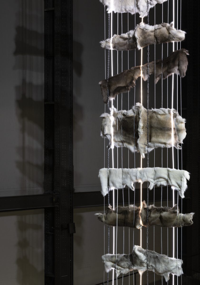 A multi-layered sculpture comprising reindeer hides tightly bound by electrical power cables stretches the full 28 metre height of the Turbine Hall. Created as a monument to honour the reindeer and acknowledge lives lost due to climate change, the title Goavve- refers to a worsening environmental condition caused by extreme temperature fluctuations, in which rain and melted snow freeze into layers of ice on the land’s surface, preventing animals from accessing food sources below. The cables represent the continued extraction of resources from Sápmi through mining and energy developments, leading to the destruction of ecosystems, the displacement of animals and people, and the erosion of cultural practices. The hides symbolise the enduring power that flows from ancestral traditions, embodying the strength, knowledge and spiritual connections passed down through generations. Goavve- serves as a powerful reminder of the interdependence of all living beings and the importance of fostering balance in our shared world.