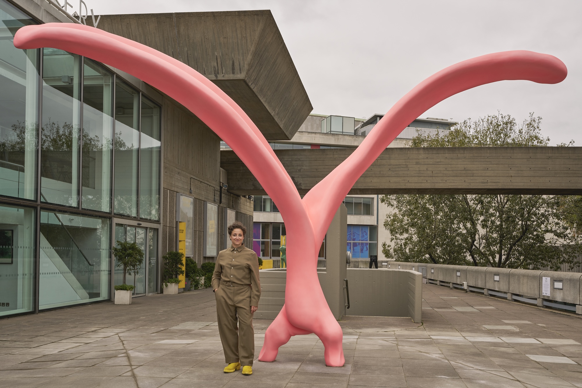 Today, the Hayward Gallery launches Mother Tongue: a monumental public art commission by Spanish artist Teresa Solar Abboud supported by Byredo and the Hayward Gallery’s Commissioning Committee. The bubblegum pink sculpture of two tongues intertwining as one dancing figure is located on the walkway in front of the Gallery’s entrance, giving the iconic brutalist site a surreal new look this Autumn. The commission marks the first time that the artist’s ambitious outdoor sculptures have been presented by a UK public art gallery.