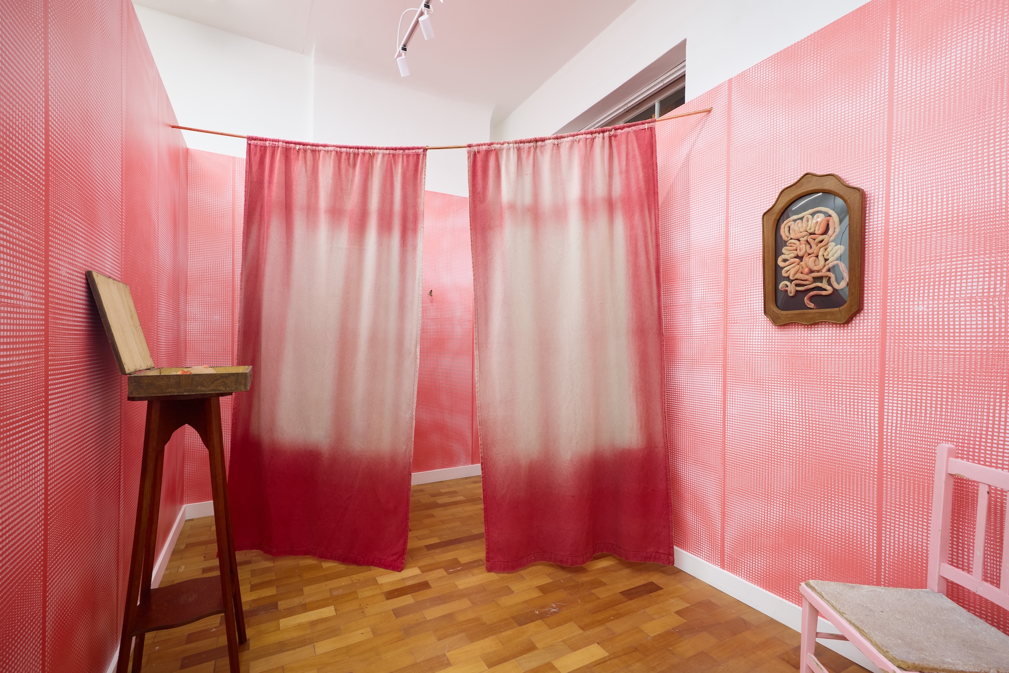 Diagonally across from the chapel in a corner of the main exhibition space, Alice Black invites visitors into an intimate space created by Rachael Louise Bailey. Sun-bleached curtains salvaged from a house clearance reveal a single bronze ear on patterned wallpaper. On closer inspection the pattern is based on the negative imprint of the plastic cages used by oyster farmers, the ear a cast of an oyster shell damaged by getting entangled in netting. The curtains are all that remain of a former Whitstable home, its guts displayed in vintage frames as a reminder of what once was.