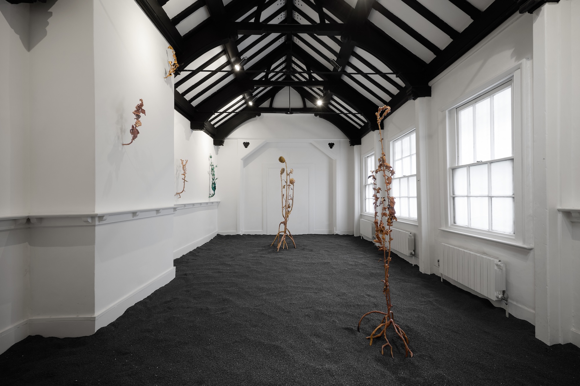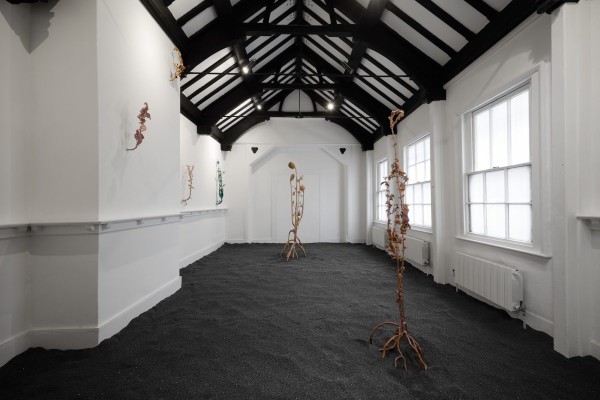 The standout highlights are a couple of site specific installations, in particular Alicja Biala’s takeover of the building’s inhouse chapel which ties in with the artist’s current solo show at Berntson Bhattacharjee’s main gallery. The visually striking installation is enhanced by the multi-sensory sensation of walking across slag which feels and sounds a little like stepping on fresh snow. I didn’t previously know that sunflowers are hyper accumulators and capable of growing in soil with high concentrations of metals, here they grow as bronze sculptures from industrial waste material that remind me of Anselm Kiefer’s homage to Van Gogh.
