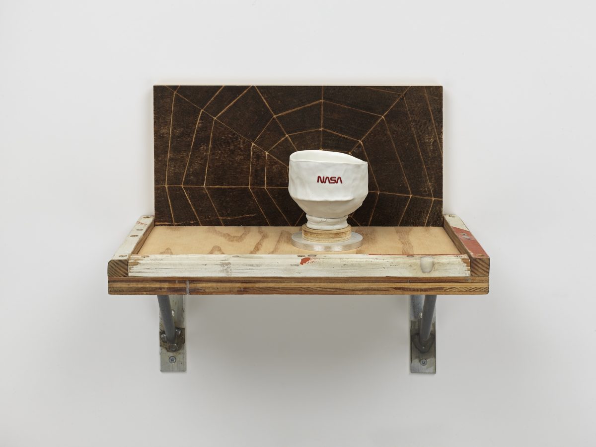 Stream of Visitors, 2025 English porcelain, plywood, ConEd barrier, epoxy resin, aluminum, steel, and hardware with pyrography 34.9 x 37.5 x 19.7 cm (13.75 x 14.75 x 7.75 in)