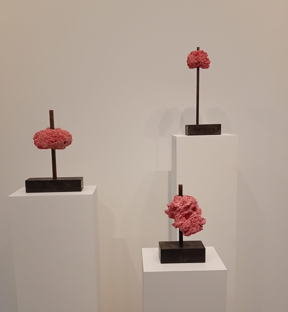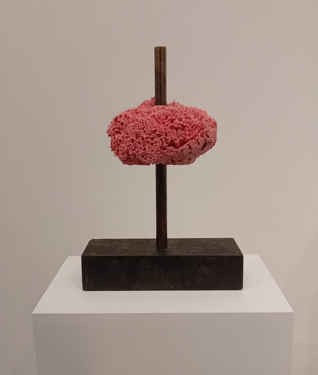 Actually these are not sponges but ceramics mounted on steel, brass and concrete from the ever-inventive Danish collective SUPERFLEX. But the idea is that they are underwater buildings in the form of sponges, acting as corporate headquarters using a new kind of architecture in which, rather than resisting the elements, the many conjoined chambers of the sponge rooms allow the water in alongside, presumably, some sophisticated system to render them habitable. Perhaps there’s a lift up the steel rod…