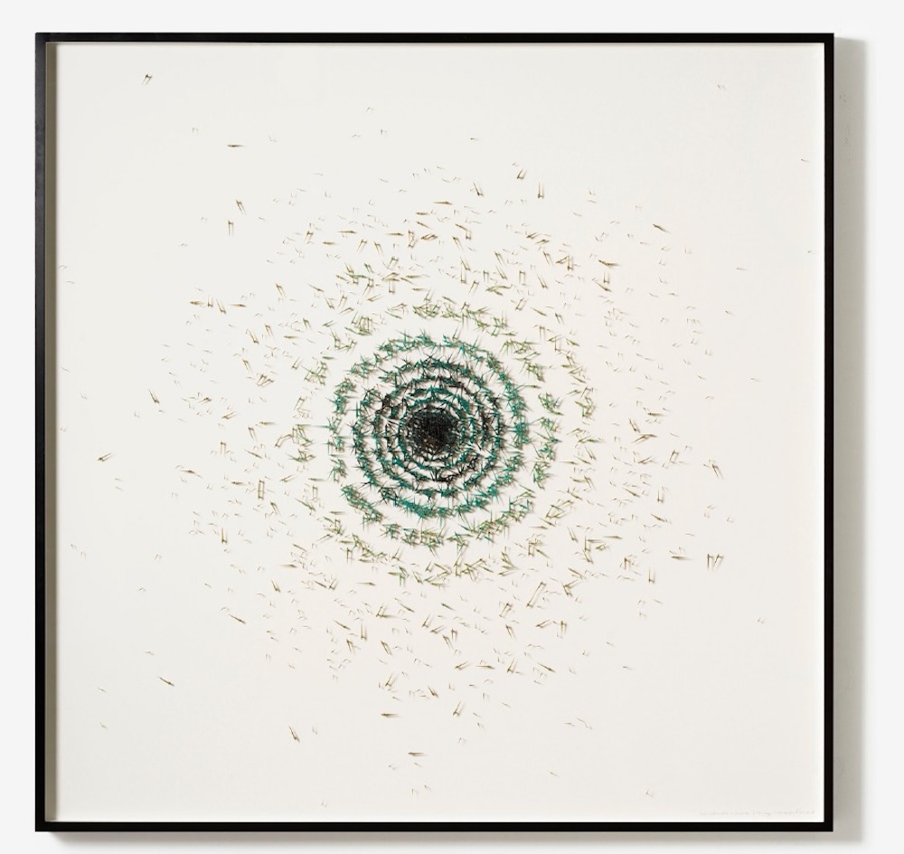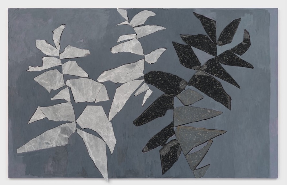 Industrial mining meets natural form in Sam Moyer’s Clippings series. For the substantial stone paintings – this is 2.5m wide – she arranges marble and granite fragments into compositions that echo the silhouettes of plants. That transforms heavyweight matter into delicate, botanical gestures, bringing fleeting and geological timescales together and suggesting some sort of alternate fossilisation.