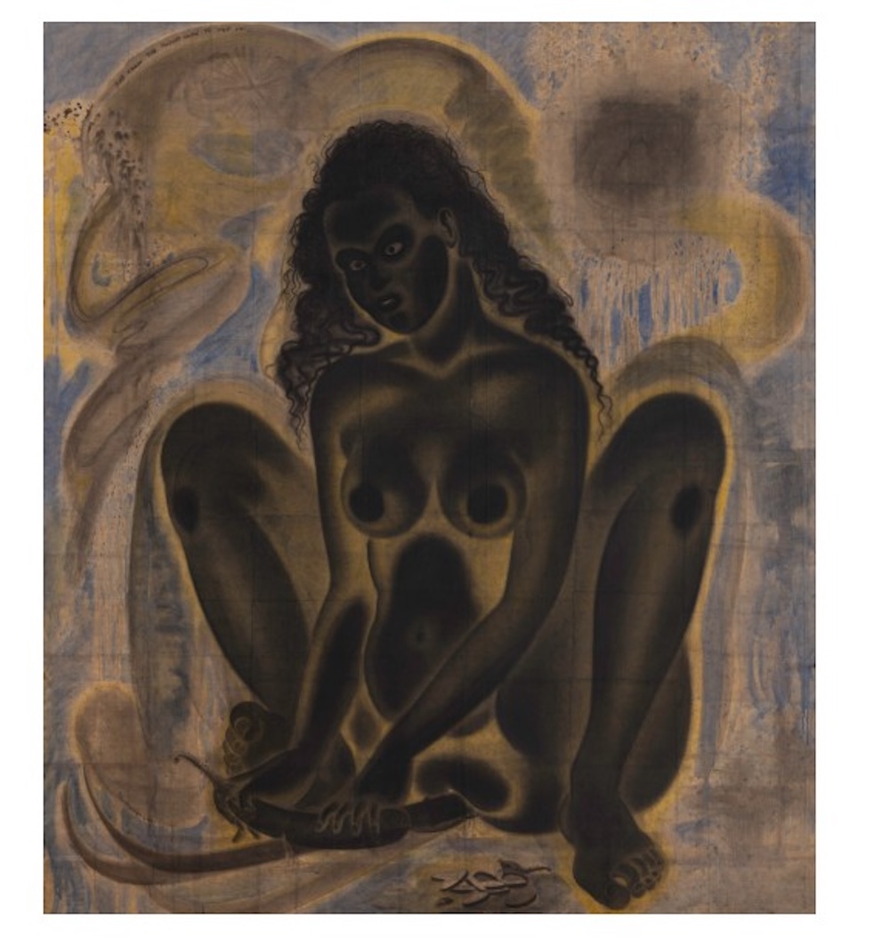 First, the materials: this is 2m high, but Venkanna restricts himself to black, blue and yellow inks on rice paper on canvas. He was nominated by Bharti Kher in the welcome ‘Artist to Artist’ section. As for the scene, the gallery provides a full description: ‘A woman squats, centred and grounded. She holds a sword, a historical symbol of violence and conquest, now transformed into an object of domesticity and pleasure. With biting irony and sensual assertion, T. Venkanna reimagines the sword not as a weapon of aggression but as an object of domesticity and pleasure. The aubergine, a stand-in for the phallus, is not destroyed but handled, redirected, controlled. The other suggests an act of self-satisfaction. This figure is neither a femme fatale nor a passive muse; she is an autonomous subject attending to her desires… In this work, sex becomes a language for critiquing patriarchy, power, and historical violence… not a provocation but a portrait of self-possession and embodied resistance.’