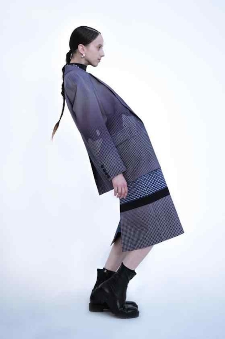In the series “Disappearing Appendages,” Qianqian Jia used materials and structural construction to explore the relationship between clothing and body perception. The suit was made from 240 grams of wool, which served as the main fabric. Using a digital inkjet technique, she created a disembodied print that challenges the conventional authority of formal wear. By reducing the weight of the fabric, she aimed to enhance the seasonality and comfort of the garment while maintaining its silhouette, making it more suitable for everyday wear.
