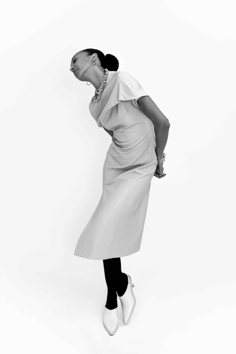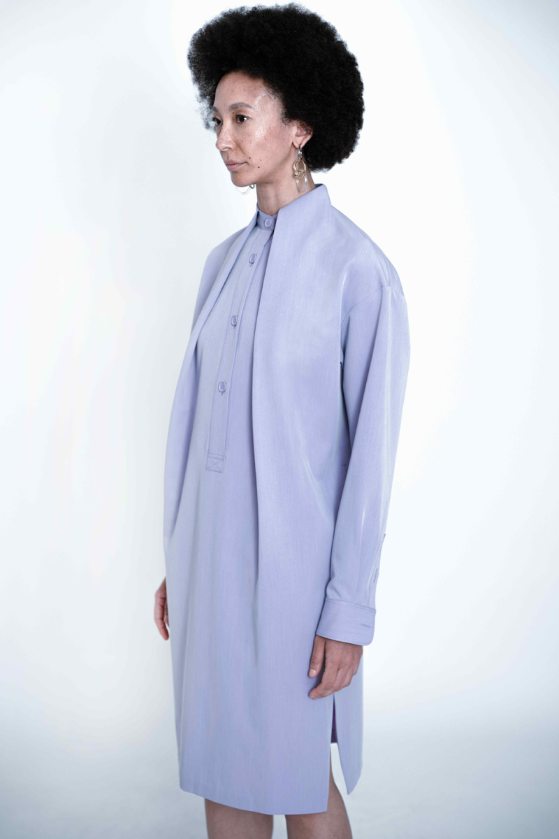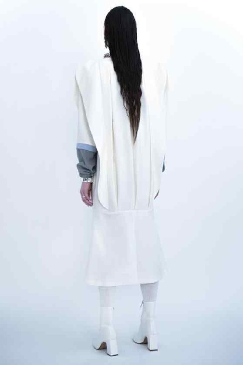 PU material served as a substitute for natural leather, merging structural design with environmental awareness. In dresses and other items, asymmetrical cuts create a shift in the center of visual gravity and redefine the relationship between the wearer and the garment’s structure.