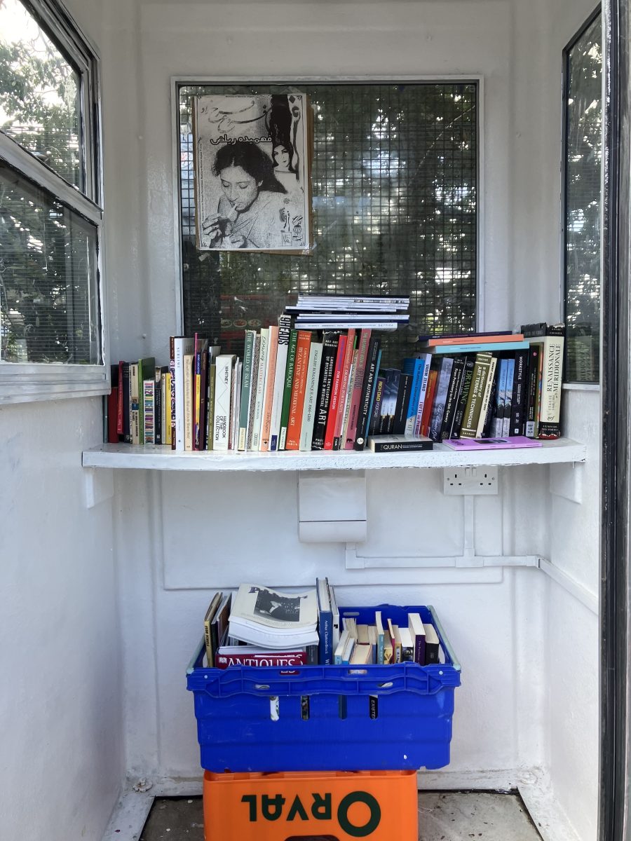 But in the weeks before the fire, we had noticed a shift. Passersby had started to make comments about the Keffiyeh-pattern wallpaper enrobing the structure — part of a recent installation called Kabinett Keffiyeh, an educational collaboration with Crystal Palace Friends of Palestine that aimed to destigmatise the Palestinian scarf as a radical or incendiary symbol. Some mentioned the Palestinian flag that had flown there during an earlier event, where poet Hafiza Ibrahim had recited a poem mourning the July killing of journalist Ismail al-Ghoul.