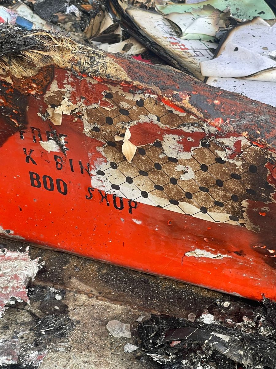 But this time, it wasn’t the council. As I swiped to open the message, I saw the image my colleague had sent: the scorched and melted fuselage of what had once been a fibreglass structure, its fibrous innards protruding like exposed nerves from a blackened hull. Near the bottom of what used to be a red porcelain enamel façade, I could still make out the letters spelling free books inside. In addition to hosting art exhibitions and performances, the Kabinett had become a community book exchange, home to nearly a hundred titles on its single shelf. Another photo showed a singed book.