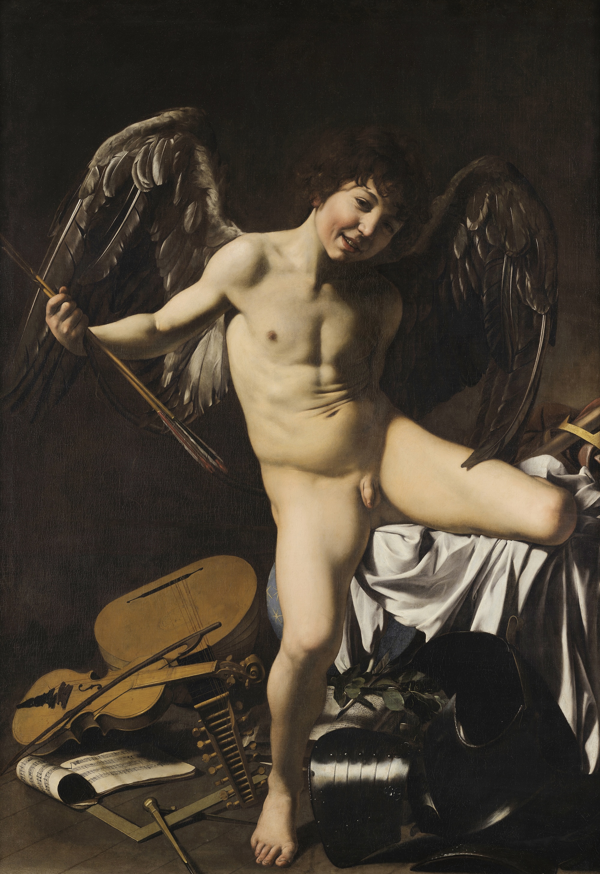 Victorious Cupid is a shocking picture, whose provocative sexuality, and full frontal nudity, stops the viewer in their tracks. Lifesize and painted from nature, a 12-year-old Roman boy – a pair of arrows thrust into his hand – wears only a pair of eagle’s wings and a cheeky grin. The painting’s theme is ’Love conquers all’ and at his feet, in disarray, lie symbols of culture, learning and power – musical instruments, a crown and sceptre, pieces of armour, a compass and set square, a laurel wreath and pen – all brought low by the mischievous god of Love. Behind him appears the sliver of a celestial globe, suggesting his triumph over all the world.