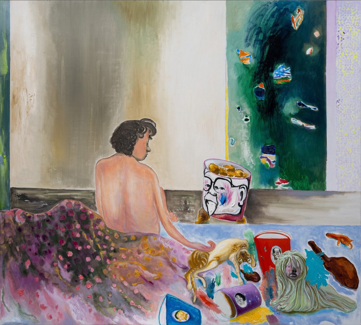 Stepping into the gallery, I was immediately struck by Duan’s sweeping brushwork and her vivid, leaping yet remarkably harmonious use of colour. As someone who also paints, I was stunned by the looseness and vitality of her surfaces. My first impression was: the artist paints with freedom—there is a boldness, even a heroic spirit—yet she also handles her materials with remarkable sensitivity. The exaggerated contrasts of colour, the precise yet economical modelling, the composition, the lively expressions, the intentionally crude and playful strokes, the quirky figures, even the KFC tucked into a pair of slippers—all these details pull you deeper into the work. I seemed to feel her focus and the momentum of her painting process. Looking at her work was exhilarating; I felt entirely seized by that energy.