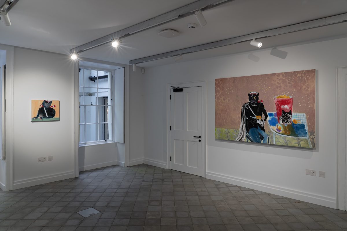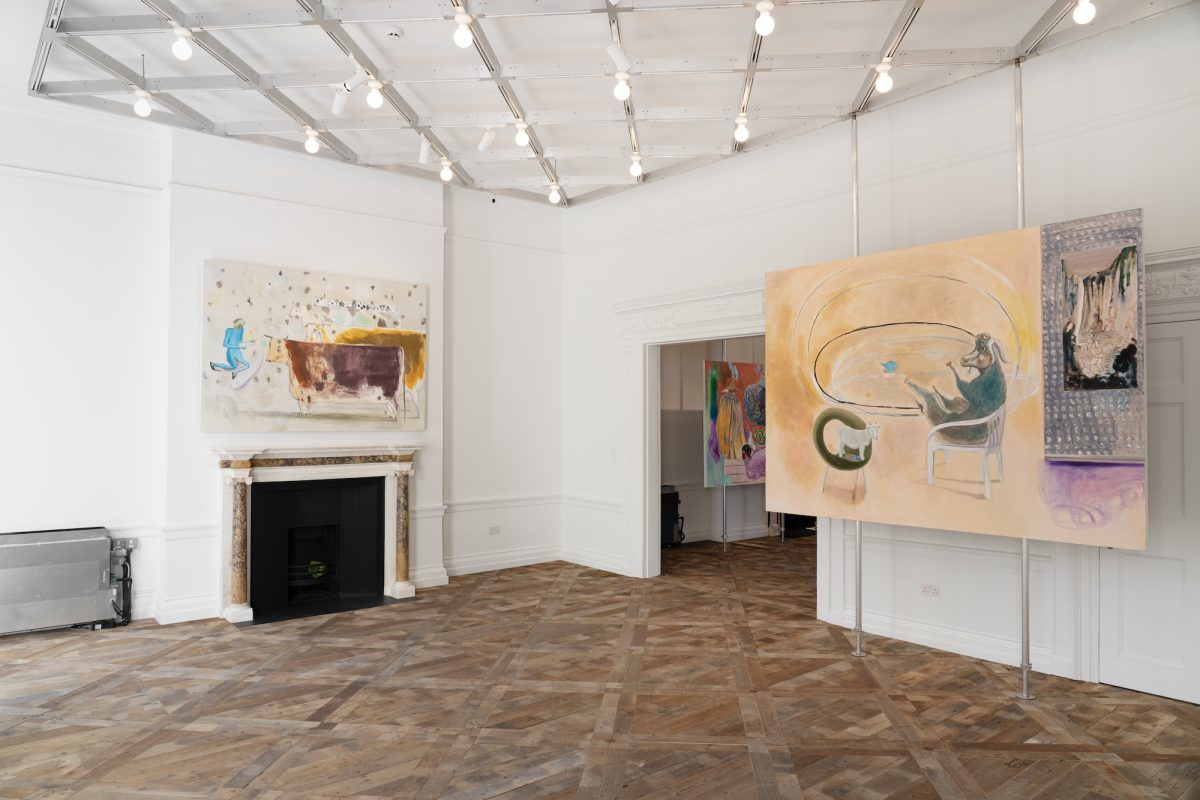 Across three floors of YDP, Duan’s imagery moves through pastoral landscapes, cluttered domestic interiors, and anachronistic cityscapes, reflecting the fractured rhythms of contemporary life. The exhibition opens with Yúqiáo No.1 (2023): an elderly goat teaching a young one in a misty landscape—a humorous yet pointed reworking of the classical master-disciple trope. Here, authority and gentle resistance coexist. In No.2, the woodcutter descends not from a mountain retreat but from a childlike, line-drawn hut, approaching his monkey bride and newborn son. Folk imagination, social-media imagery, and domestic life collapse into a single composition, transforming the traditional yúqiáo from a recluse into someone burdened by family obligations and modern absurdity.